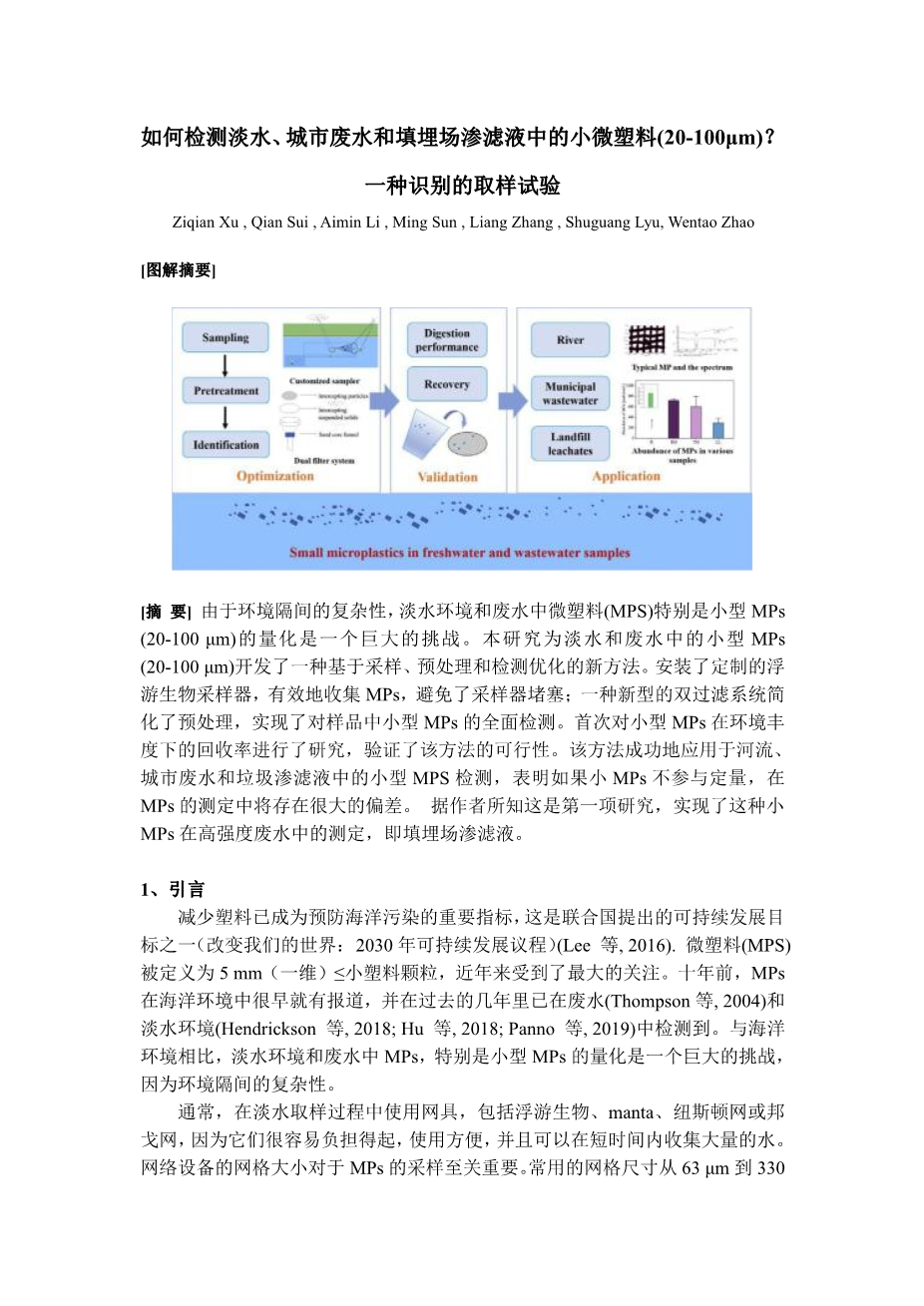 如何检测淡水、城市废水和填埋场渗滤液中的小微塑料(20-100μm)? -种识别的取样试验外文翻译资料 2023-02-16 09:50:40 英语原文共 11 页,剩余内容已隐藏,支付完成后下载完整资料 英语译文共 15 页,剩余内容已隐藏,支付完成后下载完整资料 资料编号:[258107],资料为PDF文档或Word文档,PDF文档可免费转换为Word 原文和译文剩余内容已隐藏,您需要先支付 30元 才能查看原文和译文全部内容!立即支付 发小红书推广免费获取该资料资格。点击链接进入获取推广文案即可: Ai一键组稿 | 降AI率 | 降重复率 | 论文一键排版 PREVIOUS NEXT 您可能感兴趣的文章 基于AMESim的不同充装条件下灭火器气体灭火剂释放特性模拟外文翻译资料 地下采空区灭火用抑制泡沫的流动特性研究外文翻译资料 定期检查的消防泵系统的可用性外文翻译资料 消防供水一体化研究外文翻译资料 一种新型的用于灭火的水性泡沫的制备及耐高温性能的研究外文翻译资料 在中国太湖中磷组分及pH对不同营养区沉积物磷释放的影响外文翻译资料 纳米材料融合改造新鲜冻干污水的活性污泥:测试影响了环境协定结果外文翻译资料 我国水利水电工程环境保护研究与实践中的主要问题外文翻译资料 户外生活用水影响因素关系的研究综述及理论模型外文翻译资料 雨水收集:孟加拉国干旱多发地区的水资源综合管理的实践潜力外文翻译资料