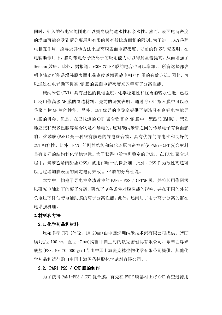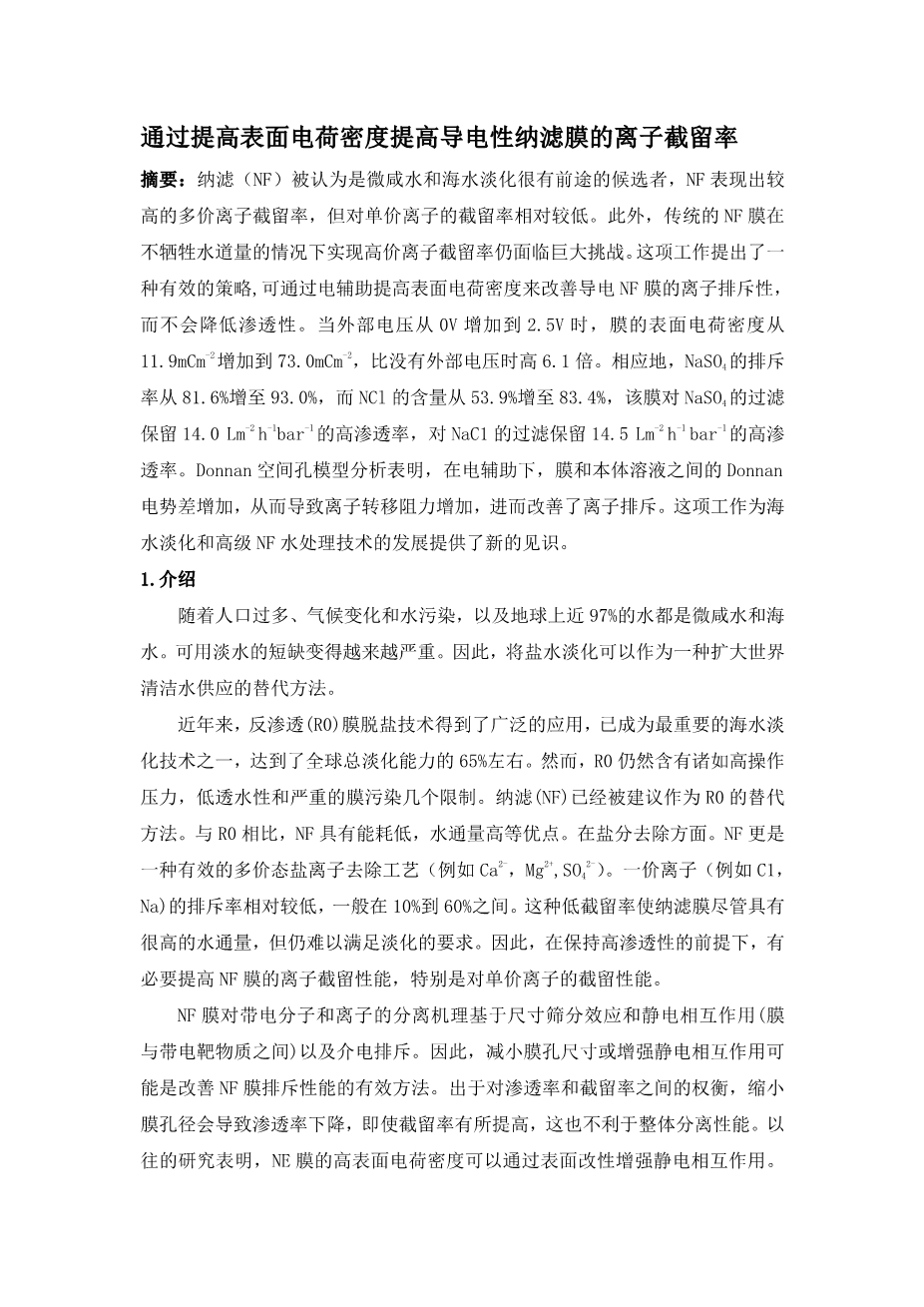 通过提高表面电荷密度提高导电性纳滤膜的离子截留率外文翻译资料 2023-02-28 23:27:16 英语原文共 10 页,剩余内容已隐藏,支付完成后下载完整资料 英语译文共 10 页,剩余内容已隐藏,支付完成后下载完整资料 资料编号:[405701],资料为PDF文档或Word文档,PDF文档可免费转换为Word 原文和译文剩余内容已隐藏,您需要先支付 30元 才能查看原文和译文全部内容!立即支付 发小红书推广免费获取该资料资格。点击链接进入获取推广文案即可: Ai一键组稿 | 降AI率 | 降重复率 | 论文一键排版 PREVIOUS NEXT 您可能感兴趣的文章 基于AMESim的不同充装条件下灭火器气体灭火剂释放特性模拟外文翻译资料 地下采空区灭火用抑制泡沫的流动特性研究外文翻译资料 定期检查的消防泵系统的可用性外文翻译资料 消防供水一体化研究外文翻译资料 一种新型的用于灭火的水性泡沫的制备及耐高温性能的研究外文翻译资料 在中国太湖中磷组分及pH对不同营养区沉积物磷释放的影响外文翻译资料 纳米材料融合改造新鲜冻干污水的活性污泥:测试影响了环境协定结果外文翻译资料 我国水利水电工程环境保护研究与实践中的主要问题外文翻译资料 户外生活用水影响因素关系的研究综述及理论模型外文翻译资料 雨水收集:孟加拉国干旱多发地区的水资源综合管理的实践潜力外文翻译资料