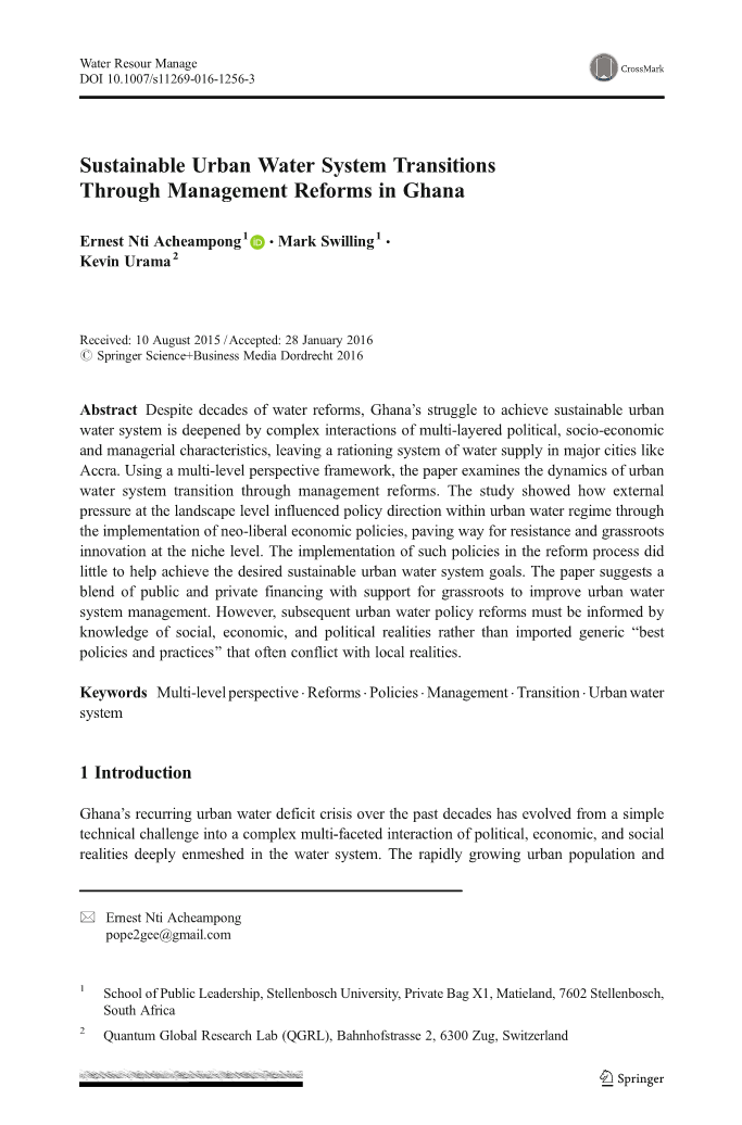 MLP框架的应用主要集中在社会技术制度发达的经济体中,很少强调现有制度内的互动和过程中固有的政治。 已经尝试倡导更多关于可持续发展转型的政治导向研究(Meadowcroft,2011)。 在本文中,我们在发展中经济背景下应用MLP框架,最小化技术进步,突出加纳城市水资源制度的社会政治方面。 本文通过加纳的管理改革为城市供水系统的可持续性转型提出了一个新的视角。