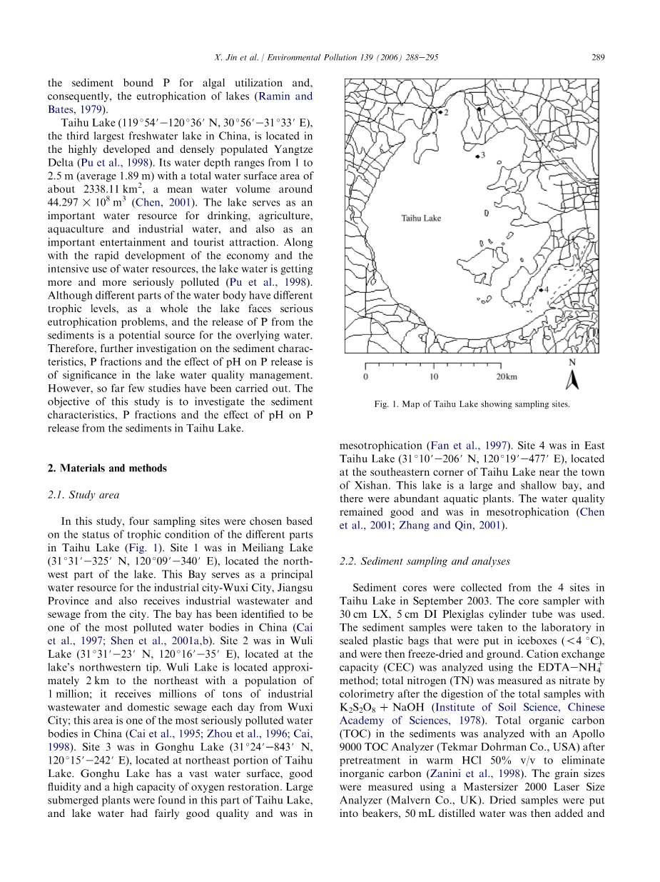 重要的娱乐和旅游景点。随着经济的快速发展和水资源的大量使用,湖水受到越来越严重的污染(Pu等,1998).虽然水体的不同部分具有不同的营养水平,但整个湖泊面临严重的富营养化问题,并且沉积物中P的释放是上覆水的潜在来源。因此,进一步研究沉积物特征,磷组分及pH对磷释放的影响,对湖泊水质管理具有重要意义。然而,到目前为止,很少有研究进行过。本研究的目的是研究沉积物特征,P组分和pH值对太湖沉积物中磷释放的影响。