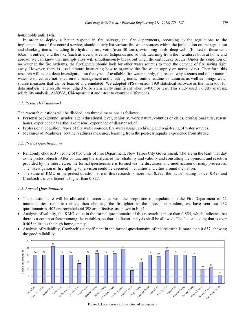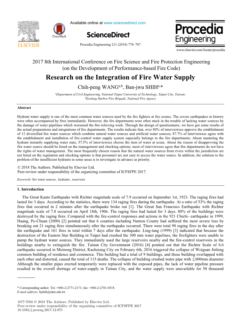 为了在消防救灾中部署更好的应对措施,消防部门应根据实施消防服务的规定,明确列出辖区内各种消防水源 的监管和检查项目,包括消防栓,水库(超过30吨),游泳池,深井(限于63.5毫米出口的那些)等(如河流, 溪流,鱼塘等)。借鉴国内外的文献,我们可以知道地震发生时会同时爆发多次火灾。在消防栓没有水的情况下, 消防人员应该寻找其他水源,以满足消防需求。然而,在正常日子里,如何组织消防供水的文献较少。因此,本 研究将对可用的消防供水类型进行深入调查,为什么河流和其他天然水资源未列入管理和检查项目,常规准备措 施,以及可以采取的国外水源措施学习和模仿。我们采用SPSS 19.0版统计软件作为数据分析的主要工具。当p = 0.05或更低时,判断结果具有统计学意义。本研究使用有效性分析,可靠性分析,ANOVA,卡方检验和t检验来检验差异。