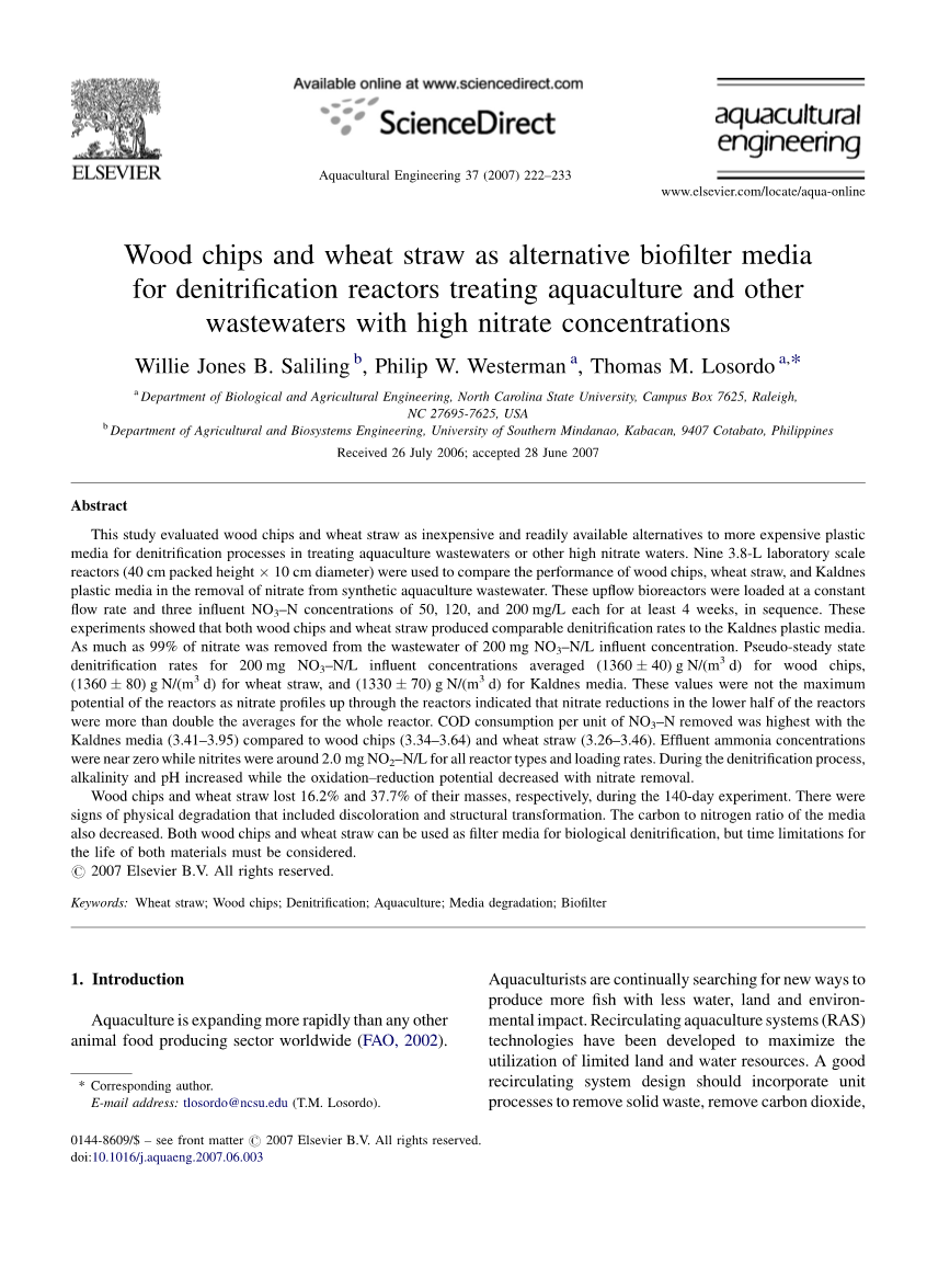 对于硝酸盐排放的担忧鼓励RAS设计人员通过实施脱氮单元过程或作为离开系统的废水的管道处理来控制废物流中的硝酸盐氮。脱氮是细菌将硝酸盐氮转化为二氮(N2)气体的过程。由于空间需求减少,使用附加的生长过程(如使用结构化介质的生物过滤器)相比悬浮生长过程在水产养殖应用中更受到青睐。然而,这种方法的限制之一是塑料介质的成本相对较高(通常超过1000美元/立方米)。许多研究调查了饮用水、住宅废水和农业径流测试农业和木材副产品作为结构化生物过滤介质的脱氮。Soareshe与Abeliovich(1998)、Aslan与Turkman(2003)的研究结果表明,麦秆可以用作生物过滤介质和饮用水脱氮的碳源。 Lowengart等人(1993)也使用麦秆来给混浊和富含氮的灌溉水脱氮。类似地,Blowes等人(1994)已经证明木屑可以用作生物过滤介质来处理径流和灌溉水。Kim等人(2003)调查了在生物滞留研究中使用木屑和麦秆去除硝酸盐。Robertson等人(2000)评估了锯屑、叶片堆肥、未加工的谷物种子和木制板材作为硝酸盐水流动的反应性屏障。最近,Robertson等人(2005年)报道了市售的木质生物过滤介质(品牌为Nitrextrade;)预处理住宅化粪池出水以除去硝酸盐氮。Volokita等人(1996)研究了将破碎报纸作为反硝化柱中的生物过滤介质。