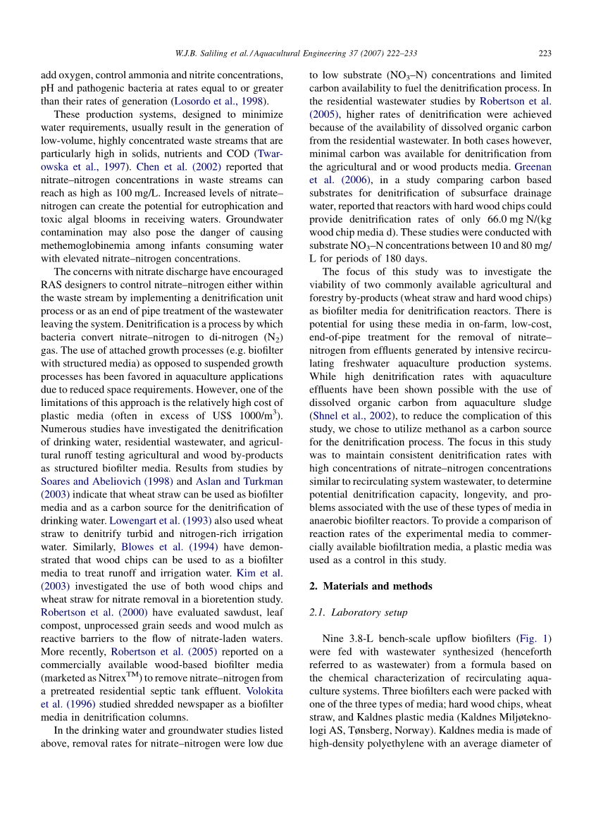 本研究的重点是调查两种常用的农林副产品(麦秆和木屑)作为脱氮反应器的生物过滤介质的可行性。在农场低成本的管道末端处理中,可以将这些介质用于从强化循环淡水养殖生产系统产生的污水中去除硝态氮。尽管其高脱氮率和水产养殖废水使用水产养殖污泥中溶解的有机碳已被证明是可能的(Shnel等人,2002),为了减少本研究的并发症,我们选择利用甲醇作为反硝化处理的碳源。本研究的重点是保持与高浓度硝酸盐-氮浓度相似的再循环系统废水的一致的脱硝率,以确定潜在的脱氮能力、使用寿命以及与在厌氧生物过滤器反应器中使用这些类型的介质有关的问题。为了比较实验介质与市售生物过滤介质的反应速率,在本研究中使用塑料介质作为对照。