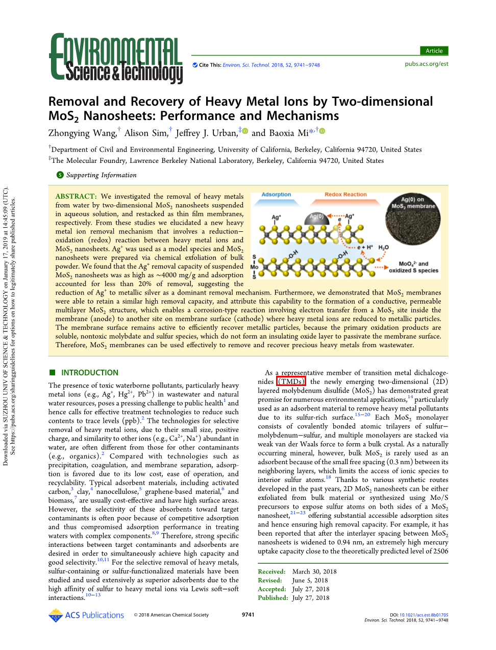 Department of Civil and Environmental Engineering, University of California, Berkeley, California 94720, United States The Molecular Foundry, Lawrence Berkeley National Laboratory, Berkeley, California 94720, United States。