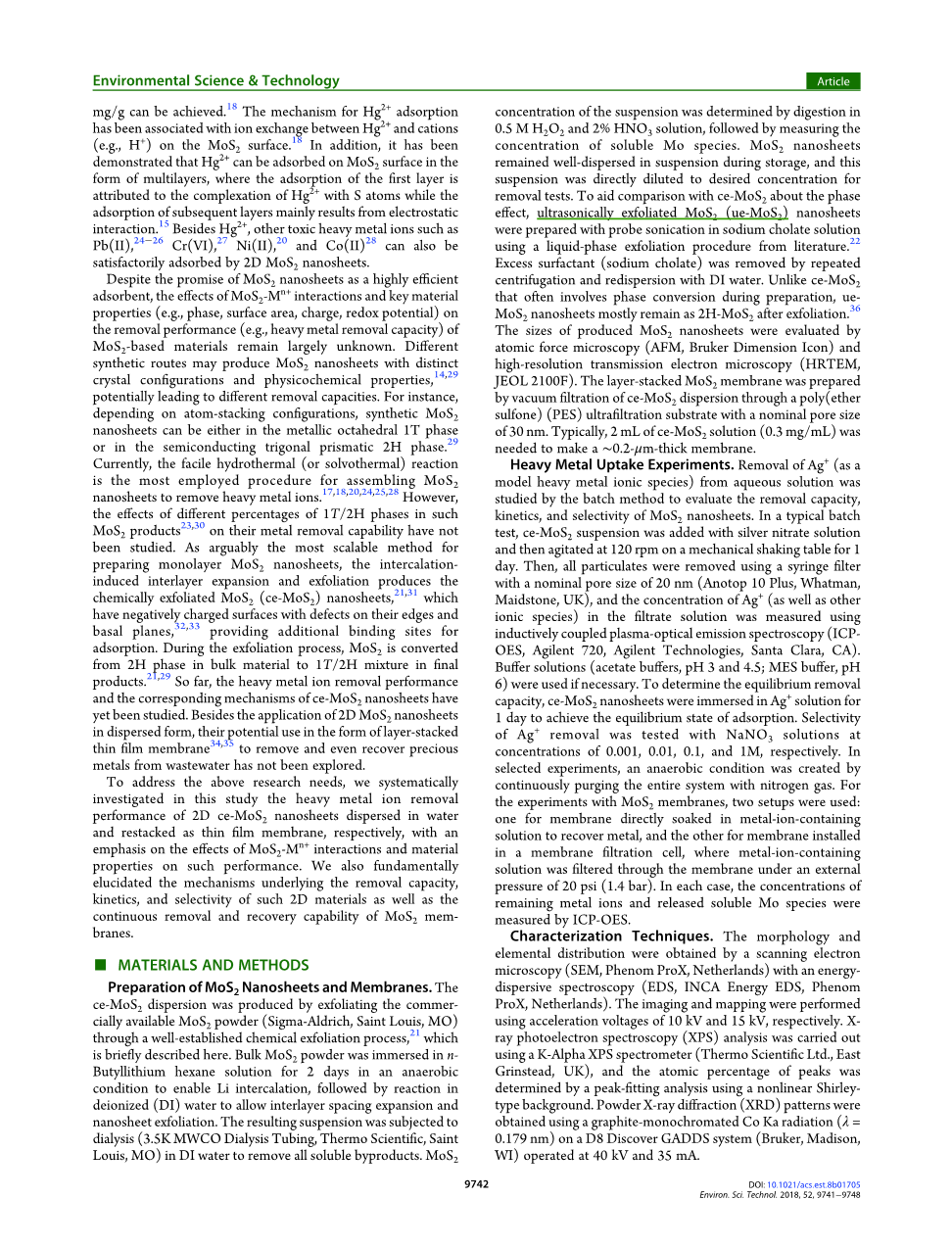 为了满足上述研究需要,我们在本研究中系统地研究了分散在水中并重新堆积为薄膜膜的2D ce-MoS2纳米片的重金属离子去除性能,重点分析了MoS2-M0n 相互作用和材料性质的影响。 在这样的表现。 我们还从根本上阐明了这种2D材料的去除能力,动力学和选择性以及MoS2膜的连续去除和回收能力的机制。