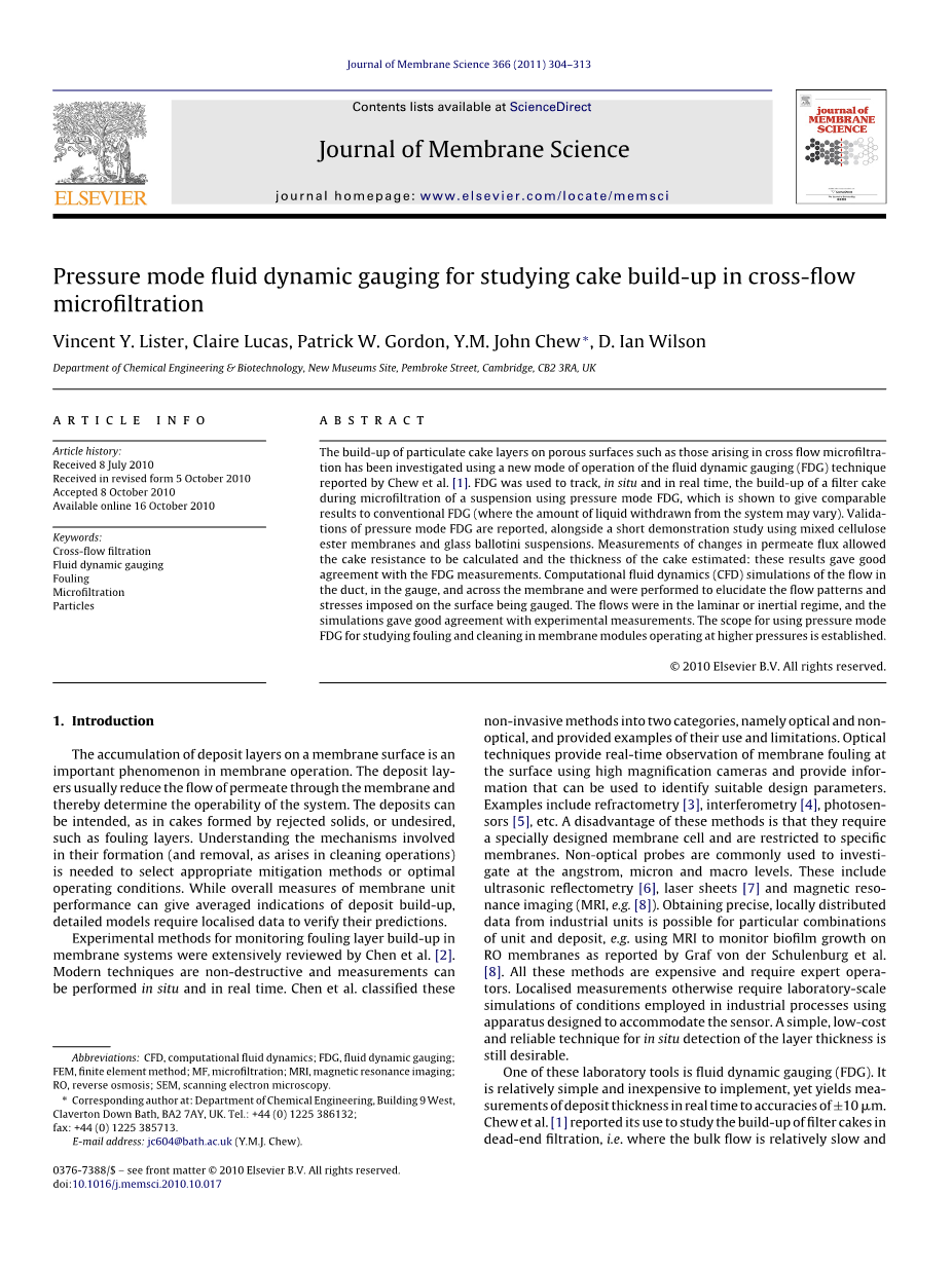 使用Chew等人报告的流体动态测量(FDG)技术的新操作模式,研究了多孔表面上微粒饼层的形成,例如横流微传输中产生的微粒饼层。〔1〕。FDG用于原位实时跟踪在使用压力模式FDG的悬浮液微滤过程中滤饼的形成情况,结果表明,与传统FDG(从系统中抽取的液体量可能不同)具有可比性。报告了压力模式FDG的有效性,以及使用混合纤维素酯膜和玻璃微珠悬浮液的短期示范研究。通过测量渗透通量的变化,可以计算滤饼阻力,并估算滤饼厚度:这些结果与FDG测量结果很好地吻合。计算流体动力学(CFD)模拟了管道内、仪表内和跨膜的流动,并解释了施加在被测表面上的流动模式和应力。模拟结果与实验测量结果吻合较好。建立了用压力模式FDG研究高压膜组件污垢和清洗的范围。