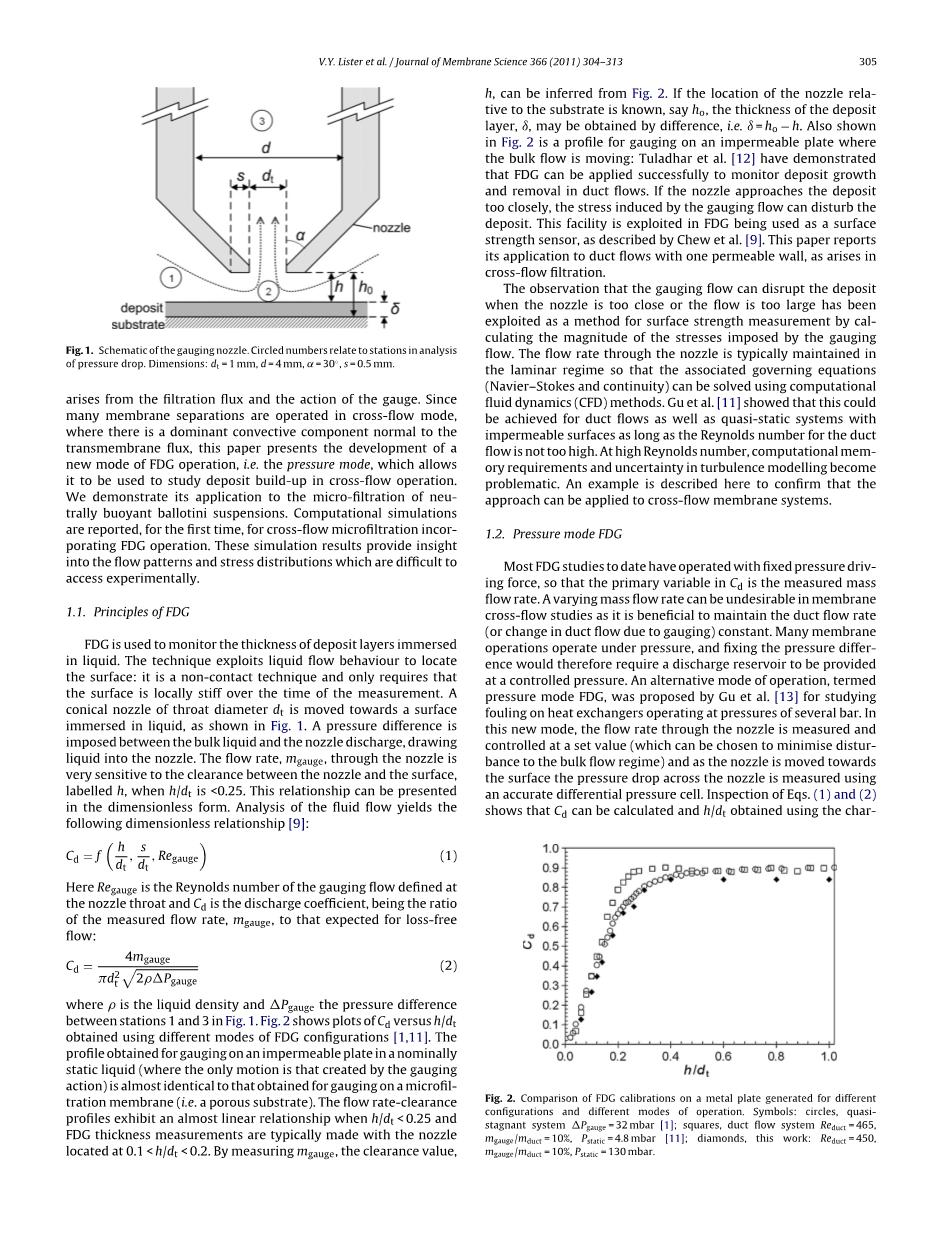 其中,液体密度和pgauge是图1中1号站和3号站之间的压差。图2显示了使用不同FDG配置模式获得的cd与h/dt的关系图[1,11]。在名义上静止的液体(其中唯一的运动是由测量作用产生的)中,用于测量不透水板的剖面几乎与在微滤膜(即多孔基质)上测量所获得的剖面相同。当h/dtlt;0.25时,流量间隙曲线几乎呈线性关系,并且通常在喷嘴位于0.1lt;h/dtlt;0.2时进行fdg厚度测量。通过测量mgauge,间隙值h,可从图2推断。如果已知与基板相关的喷嘴位置,例如Ho,则沉积层厚度_可通过差异获得,即_=Hominus;H。图2中还显示了在不透水板上测量体积流量移动的剖面图:Tuladhar等人[12]已经证明,FDG可以成功地应用于监测管道流量中沉积物的生长和去除。如果喷嘴靠近沉积物太近,测量流量引起的应力会干扰沉积物。如Chew等人所述,该设施在用作表面强度传感器的FDG中得到开发。〔9〕。本文报道了它在横流过滤中应用于单壁可渗透管道中的情况。