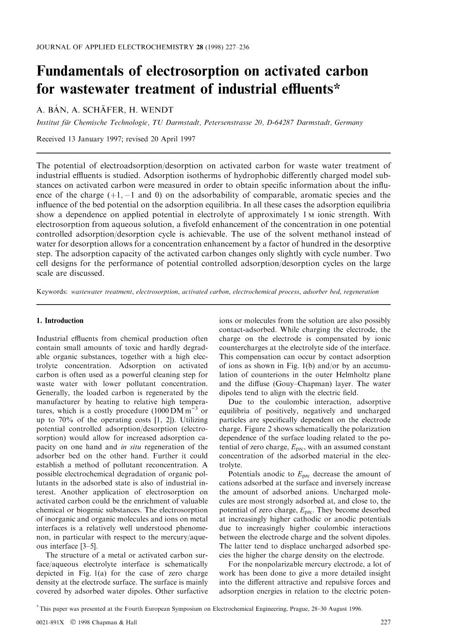 化学生产中的工业废气通常含有少量有毒和难以降解的有机物质,以及高电解质浓度。活性炭上的吸附通常用作污染物浓度较低的废水的强力清洁步骤。通常,负载的炭被再生制造商通过加热到相对高温,这是一个昂贵的程序( 1000 DM m-3 或高达70 % 的运营成本[1,2])。利用潜在的受控吸附/解吸(电吸附)可以增加吸附能力,另一方面是吸附床的原位再生。此外,它可以建立污染物再浓缩的方法。在吸附状态下有机污染物的可能的电化学降解也具有工业意义。在活性炭上电吸附的另一个应用可以是富含有价值的化学或生物物质。金属界面上的无机和有机分子和离子的电吸附是相对容易理解的现象,特别是对于汞/水性界面[3-5]。
