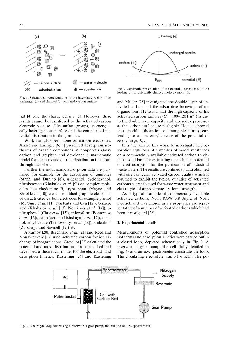Abramov[20],Besenhard等,[21]和Reed和Nonavinakere [22]使用活性炭进行无机离子的离子交换。Grevillot [23]计算了填充床中的电位和质量分布,并开发了电子和解吸动力学的理论模型。Kastening [24]和KasteningMuller[25]研究了双层活性炭和无机离子的吸附行为。他发现他的活性炭样品(C=100-120 Fg-1)的高容量是由于双层容量,炭表面的任何氧化还原过程都可以忽略不计。他还表明,无机离子的特定吸附发生,导致零电荷电位E普茨克的增加/减少。