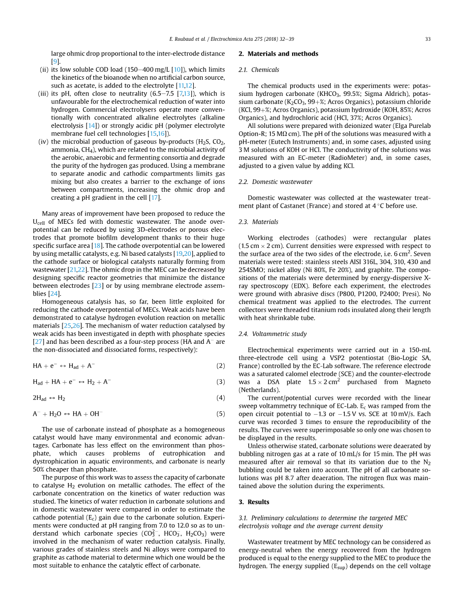 2. 材料和方法 2.1. 化学物质 实验所用化学产品为:碳酸钾-sium (KHCO3, 99.5%;西格玛奥德里奇)、碳酸potas-sium (K2 CO3, 99thorn;%;在穿越有机物)、氯化钾(氯化钾,99thorn;%;氢氧化钾(KOH, 85%;和盐酸(HCl, 37%;在穿越有机物)。用去离子水(Elga纯abopp - r;15mu;厘米)。溶液的pH值用pH计(Eutech仪器)测量,在某些情况下,使用3 M溶液的KOH或HCl进行调整。溶液的电导率用EC-meter(辐射计)测量,在某些情况下,通过添加KCl调整到给定值。 2.2. 国内废水 生活污水收集自Castanet(法国)污水处理厂,在使用前储存于4摄氏度。 2.3. 材料 工作电极(阴极)为1.5 cm times; 2cm的矩形板。电流密度表示为电极两侧表面积,即6 cm2。测试了七种材料:不锈钢AISI 316L、304、310、430和254SMO;镍合金(Ni 80%, Fe 20%)和石墨。用能量色散x射线能谱(EDX)测定了材料的组成。每次实验前,电极均用研磨盘(P800、P1200、P2400)研磨;主席)。电极未进行化学处理。电流收集器是螺纹绝缘钛棒沿热收缩管的长度。 2.4. 伏安研究 利用EC-Lab软件控制的VSP2恒电位器(Bio-Logic SA,法国)在150毫升三电极电池中进行电化学实验。参比电极为饱和甘汞电极(SCE),对电极为1.5 cm2的DSA板,购自Magneto(荷兰)。 用EC-Lab线性扫描伏安技术记录电流/电位曲线。在10 mV/s时,Ec从开路电位上升到1.3或1.5 V vs. SCE。每条曲线记录3次,来保证结果的重现性。这些曲线是重叠的,因此在结果中只选择了一条。 除另有说明外,碳酸盐岩溶液以10 mL/s的速率鼓泡氮气进行脱气15min。除气后测量pH值,考虑氮气鼓泡对pH值的影响。所有碳酸盐岩溶液除气后pH值均为8.7。实验过程中,氮通量主要保持在溶液上方。 3. 结果 3.1. 初步计算确定目标MEC电解电压和平均电流密度 采用MEC技术进行水处理,当从制氢过程中回收的能量与MEC制氢过程所获得的能量相等时,可以认为是能源中性处理。所提供的能量(Esup)取决于电池电压。 |