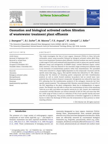 臭氧化后的生物砂过滤有可能进一步去除一些微量有机合成物和减少非特异性毒(Gouml;bel等,2007;Reungoat等, 2011;Stalter等, 2011)。活性炭也是一种常用于支持生物活性的媒介,尽管其比沙子更高效,但在污水的深度处理中并受到关注较少。所谓的活性炭过滤已经在饮用水处理方面使用多年,通常在臭氧化后使用,并且已经证明能够显著去除天然有机物、臭氧化转化产物、消毒副产物前体以及味道和气味化合物,例如土臭素和2-甲基异冰片(Simpson,2008)。