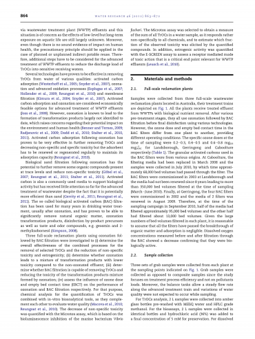 通过三个使用臭氧化和生物活性炭滤池的全面废水回收厂来研究一下观点:(i)确认该联合方法用于去除选定的TrOC和减少非特异性毒性和雌激素的总体有效性;(ii)确认与为进行臭氧化的污水相比,臭氧化后的污水是否会产生毒性较低的混合转化产物;(iii)确认生物炭过滤是否有能力去除TrOCs和减少由臭氧化所形成的混合转化产物的毒性;(iv) 评估臭氧剂量和空床接触时间(EBCT)分别对臭氧化和活性炭过滤性能的影响。以此为目的,将用于量化TrOC的化学分析与体外生物分析工具相结合,互相补充来评估水质(Macova et al., 2010;Reungoat et al., 2010)。并使用Microtox测定法定量非特异性毒性的降低,该测定基于海洋细菌费氏弧菌的生物发光抑制作用,选择Microtox测定法以获得水样中所有TrOCs总和的量度,因为该方法对所有化学物质都能作出非特异性响应,并估计观察到的毒性的哪个部分是由定量化合物引起的。同时,应用E-SCREEN测定法定量雌激素活性,用于评估受体介导的毒性作用模式,这是与污水处理厂的污水排出相关的关键终点(Leusch等,2010)。