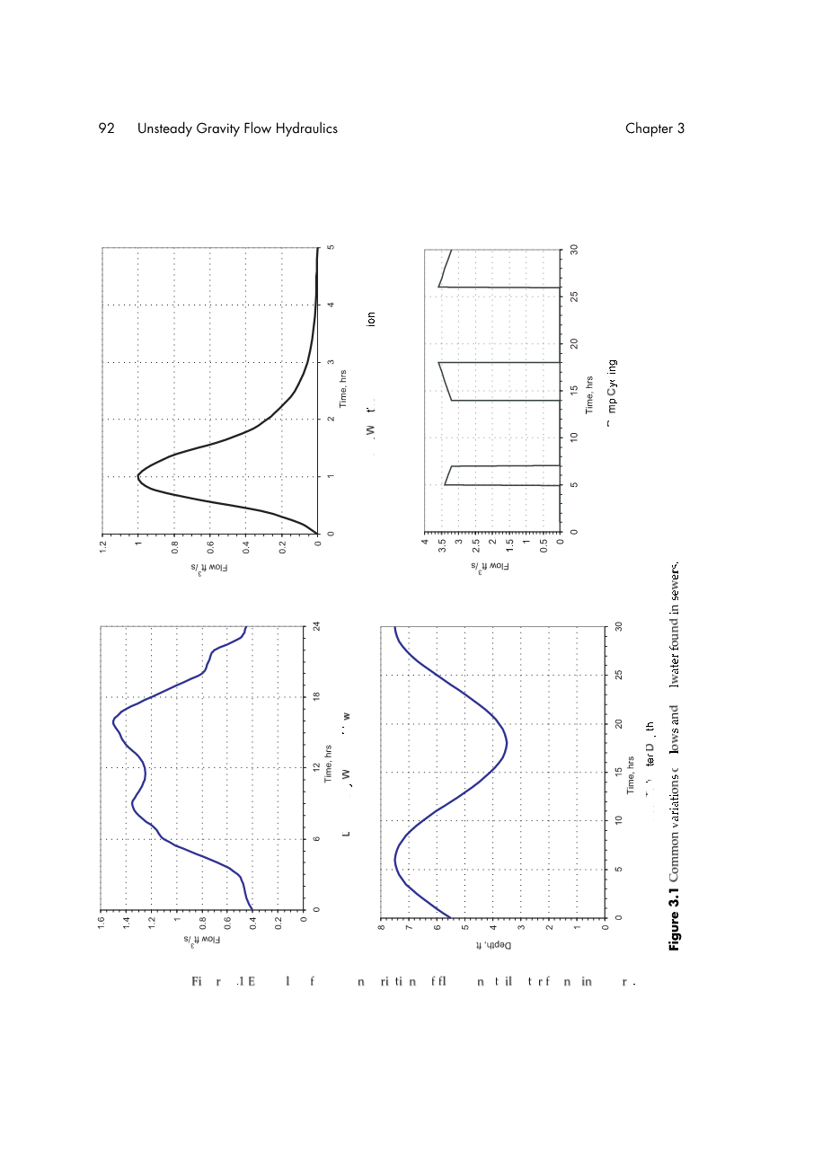这些时变动态条件如图3.1所示。在分析现有下水道系统的容量限制和溢流情况时,它们尤其重要。与新的土地开发设计污水管道的问题不同,不稳定的水流和溢流成为旧系统的关键问题。泵站的分析也需要量化流量的时间变化。