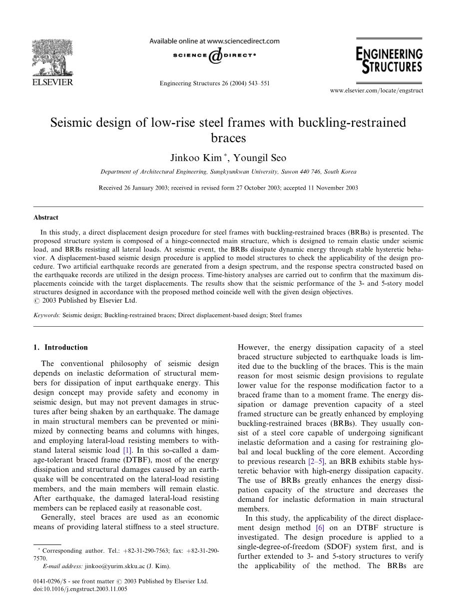 带有屈曲约束支撑的低层钢框架的抗震设计外文翻译资料