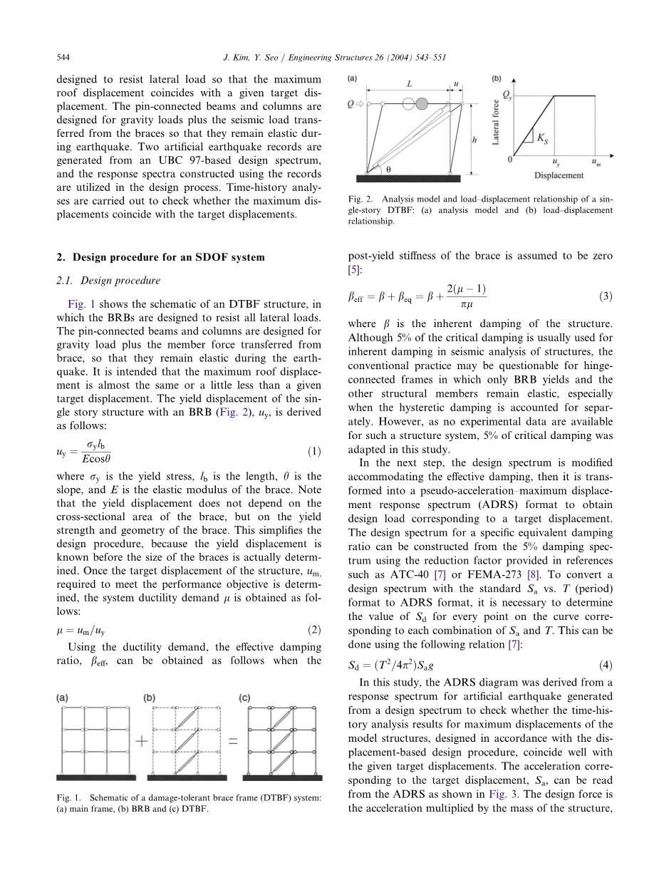 研究了直接位移设计方法[6]在DTBF结构上的适用性。设计过程首先应用于单自由度(SDOF)系统,并进一步扩展到三层和五层结构以验证该方法的适用性。BRBs设计用于抵抗侧向荷载,使最大顶板位移与给定的目标位移一致。与支柱相连的梁和柱是为重力载荷加上从支架上转移的地震载荷而设计的,这样它们在地震中保持弹性。两个人工地震记录来自基于UBC 97的设计谱,使用记录构建的响应谱进行设计。进行了时间-历史分析,以确定最大位移是否与目标位移一致。