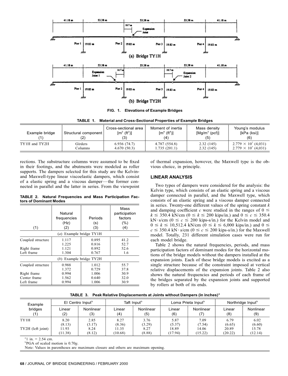 这些桥梁模型的几何形状和边界条件如图1所示。模型的材料和横截面特性列于表1中。这些桥梁的自由振动以水平为主,每个单独的周期范围为0.5秒到1.0秒。发生在与伸缩缝不同的周期中。