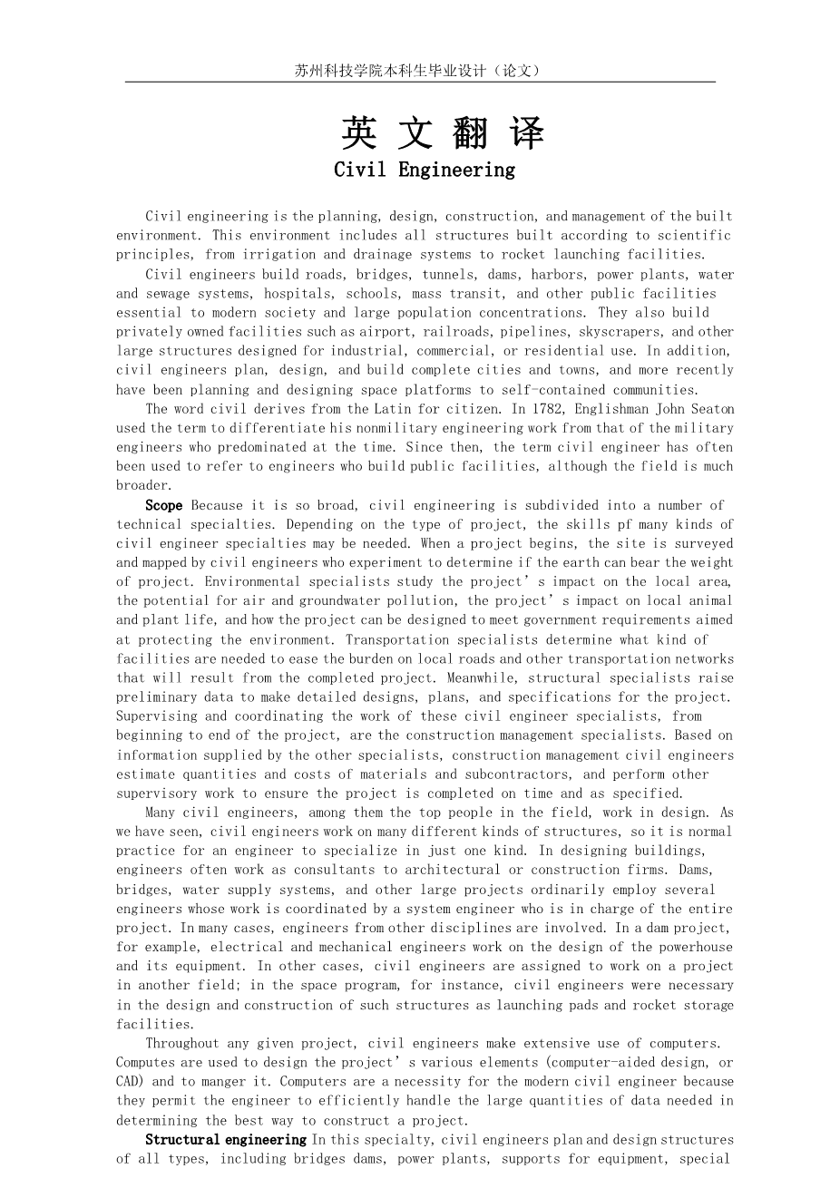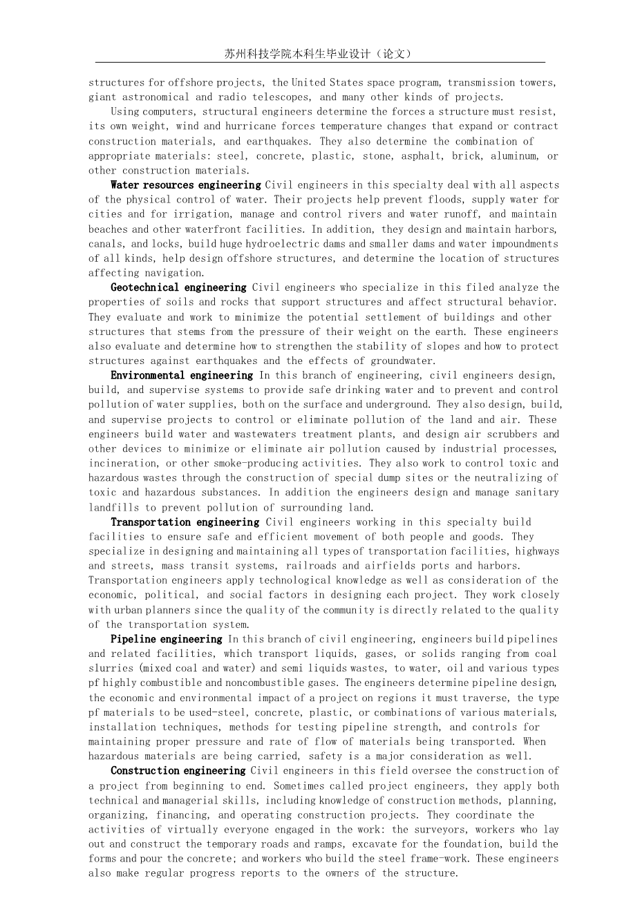 Scope Because it is so broad, civil engineering is subdivided into a number of technical specialties. Depending on the type of project, the skills pf many kinds of civil engineer specialties may be needed. When a project begins, the site is surveyed and mapped by civil engineers who experiment to determine if the earth can bear the weight of project. Environmental specialists study the project’s impact on the local area, the potential for air and groundwater pollution, the project’s impact on local animal and plant life, and how the project can be designed to meet government requirements aimed at protecting the environment. Transportation specialists determine what kind of facilities are needed to ease the burden on local roads and other transportation networks that will result from the completed project. Meanwhile, structural specialists raise preliminary data to make detailed designs, plans, and specifications for the project. Supervising and coordinating the work of these civil engineer specialists, from beginning to end of the project, are the construction management specialists. Based on information supplied by the other specialists, construction management civil engineers estimate quantities and costs of materials and subcontractors, and perform other supervisory work to ensure the project is completed on time and as specified.