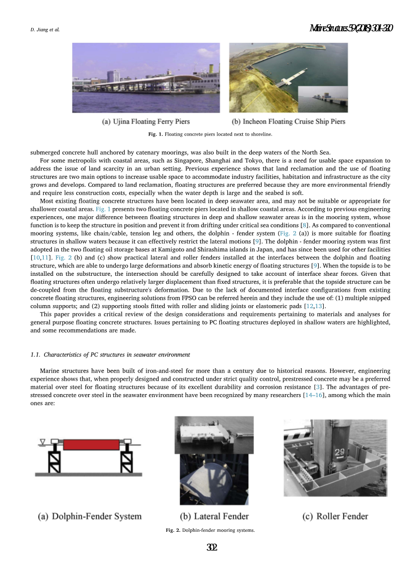 大多数现有的浮式混凝土结构位于深海海域,可能不适合浅海沿岸地区。 图1显示了位于浅海沿岸地区的两个混凝土墩。 根据以往的工程经验,在深海和浅海水区域的软化结构之间的一个主要问题是系泊系统,其作用是保持结构的位置并防止它在临界海况下漂移[8]。 与传统的系泊系统相比,如链/缆绳,张力腿等,海豚 - 挡泥板系统(图2(a))更适合浅海水域的结构,因为它可以有效地限制侧向运动[9] 。 海豚 - 挡泥板系泊系统首先在日本上本和白岛两个营养储油基地采用,并已被用于其他设施[10,11]。 图2(b)和(c)显示了实际的横向和滚轮挡泥板安装在海豚和软化结构之间的界面,它们能够承受大的变形并吸收软化结构的动能[9]。 当顶部安装在下部结构上时,应仔细设计交叉点以考虑界面剪切力。 鉴于浮式结构通常经历比固定结构更大的位移,优选的是,顶侧结构可以从浮式结构的变形解耦合。 由于缺乏来自现有混凝土浇筑结构的文件化界面配置,FPSO的工程解决方案可以在此处提及,并且包括使用:(1)多个剪切柱支撑; 和(2)支撑与滚子和滑动接头或弹性垫[12,13]的凳子。