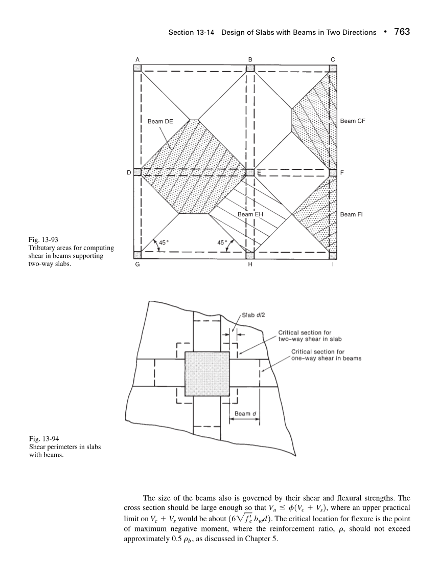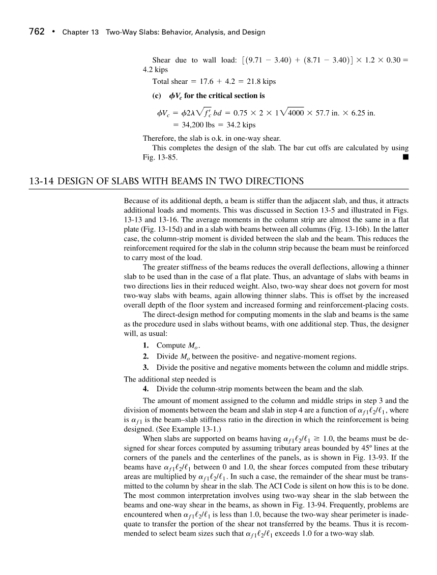 由于梁额外的高度,梁比邻近的楼板刚度更大,因此它吸引了额外的荷载和弯矩。这已经在13-5节讨论过,并在图13-13和图13-16中说明。在一个平板(图13-15d)和所有柱之间有梁的平板(图13-16b)中,柱带的平均弯矩几乎相同。在后一种情况下,柱顶弯矩在板和梁之间分配。由于梁必须加强以承载大部分荷载,因此减少了在柱带中板所需的加固要求。