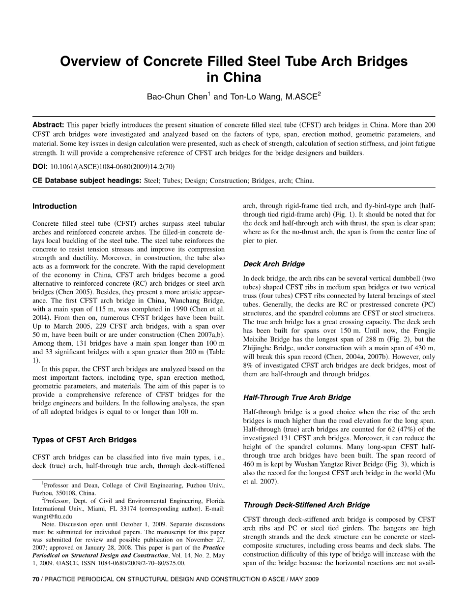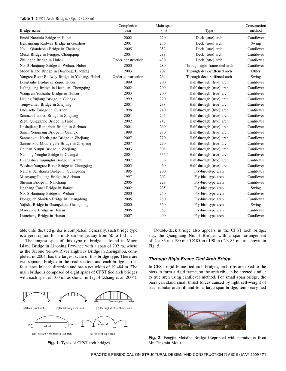 钢管混凝土拱桥(CFST)已经超越了钢管拱和钢筋混凝土拱桥。其中的嵌缝混凝土在钢管局部屈曲,而钢管增强了混凝土抗拉应力,提高整体抗压强度和延性。此外,在施工中,管也作为混凝土的模板。随着我国经济的快速发展,钢管混凝土拱桥成为钢筋混凝土拱桥或钢拱桥的良好选择。此外,他们呈现出一种更有艺术性的表现。中国第一个CFST拱桥在1990年竣工,其主跨度为115米。从那时起,建造了许多CFST桥梁。截至2005年3月,已建成或正在建设的CFST拱桥有229座,跨度超过50米。其中,131座桥梁的主跨度超过100米和33座桥梁,跨度超过200米(表1)。
