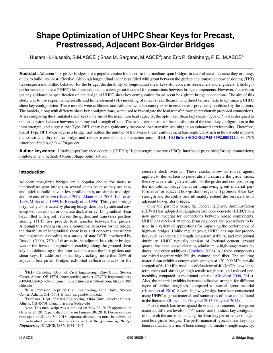 相邻的箱梁桥是几种状态下短跨度到中跨跨度桥的流行选择,因为它们制作简单快捷,具有较低的剖面深度,设计简单并且具有成本效益(Russell 2009; Aktan 2005; Lall 1998; Miller; El-Remaily)。这种类型的桥梁通常是通过将箱梁并排放置并覆盖沥青或混凝土甲板覆盖层来建造的。纵向剪力键填充梁和横向后张(TPT)连接之间的灌浆,可在梁之间传递载荷。尽管该系统确保了桥梁的整体性能,但纵向剪力键的耐久性仍然与研究人员和工程师有关。根据Russell(2009)对状态DOT进行的一项调查,相邻箱梁桥中75%的遇险情况是沿着灌浆剪力键纵向开裂,箱梁和剪力键之间的界面松脱。除剪切键开裂外,超过65%的相邻箱梁桥梁在其中表现出反射裂缝