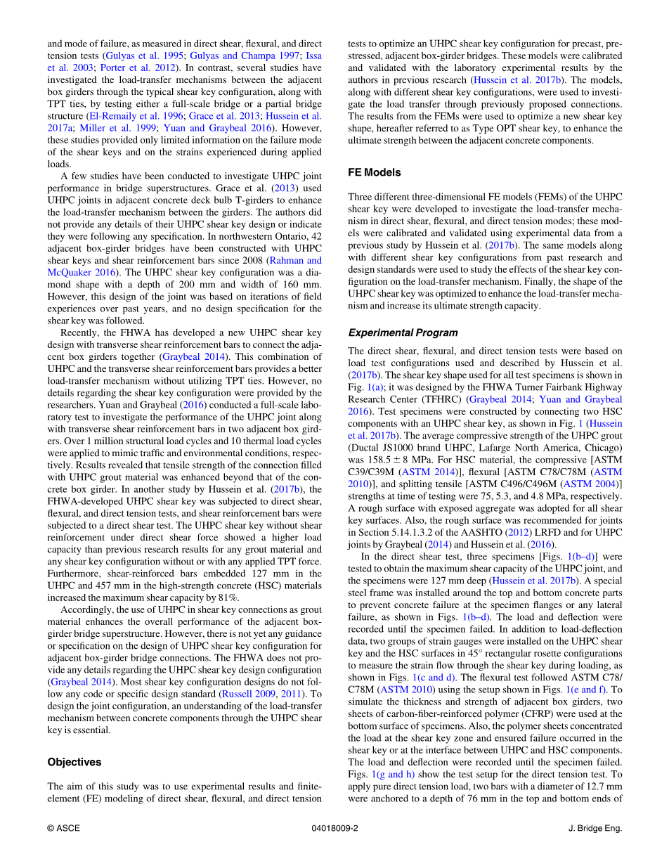 (Gulyas等,1995; Gulyas和Champa,1997; Issa等,2003; Porter等,2012)中测量的失效模式和失效模式。相比之下,一些研究通过典型的剪力键配置以及TPT连接,通过测试全尺寸桥梁或部分桥梁结构来研究相邻箱梁之间的荷载传递机制(El-Remaily et al。1996 ; Grace等2013; Hussein等2017a; Miller等1999; Yuan和Graybeal 2016)。然而,这些研究仅提供了关于剪力键的失效模式和施加载荷期间所经受的应变的有限信息。