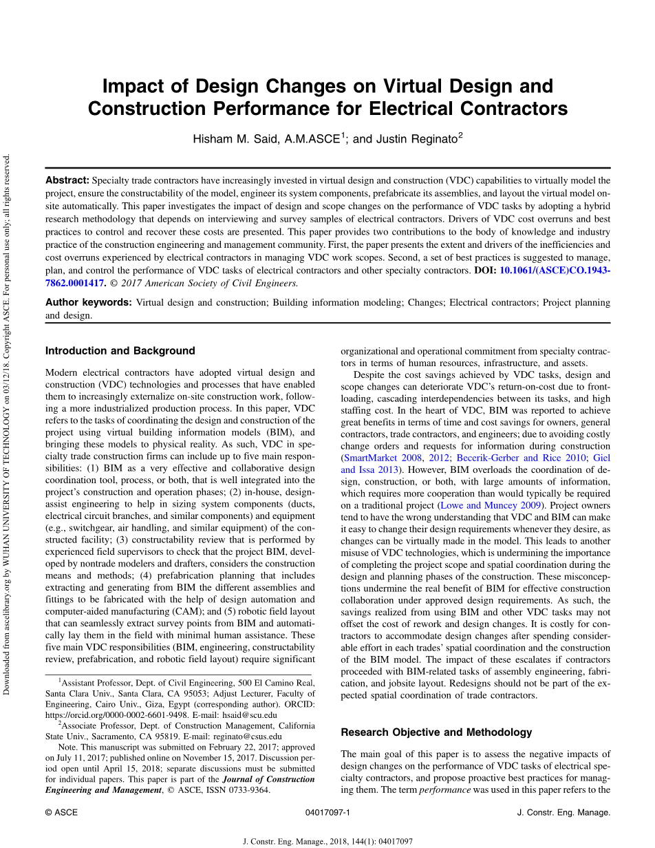 摘要:专业贸易承包商已经越来越多地投资于虚拟设计与施工(VDC)的功能来模拟项目,确保模型的可实施性,设计它的系统内容、预制组件、自动布置虚拟模型。本文采用了一种混合研究方法,考察了电气承包商的访谈和调查样本,研究了设计和范围变化对VDC任务性能的影响。提出了VDC成本超支的驱动因素以及控制和回收这些成本的最佳做法。本文对建筑工程和管理界的知识和工业实践有两方面的贡献。首先,本文提出了电气承包商在管理VDC工作范围时所经历的效率低下和成本超支的程度和驱动因素。第二,提出了一套最佳做法,以管理、计划和控制电气承包商和其他专业承包商的VDC任务的性能。