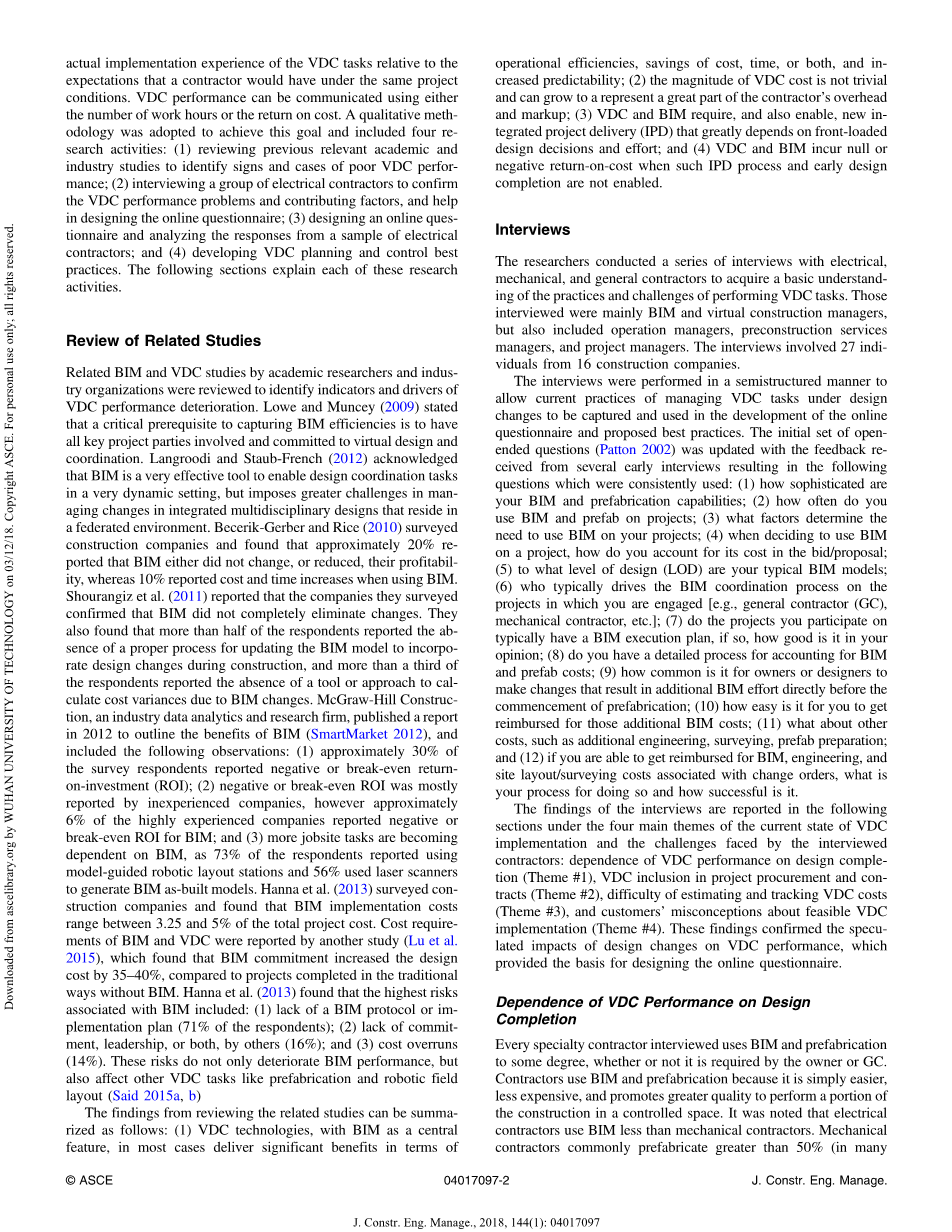 在对VDC实施现状四大主题下的采访承包商面临的挑战下,下面是这次的采访报告:VDC性能对设计完成的依赖性(主题# 1)、项目采购和合同VDC夹杂物(主题# 2),估计与跟踪系统成本的困难(主题# 3),和客户对VDC实施可行性的误解(主题# 4)。这些发现证实了设计变更对VDC性能的推测影响,为设计在线问卷提供了依据。