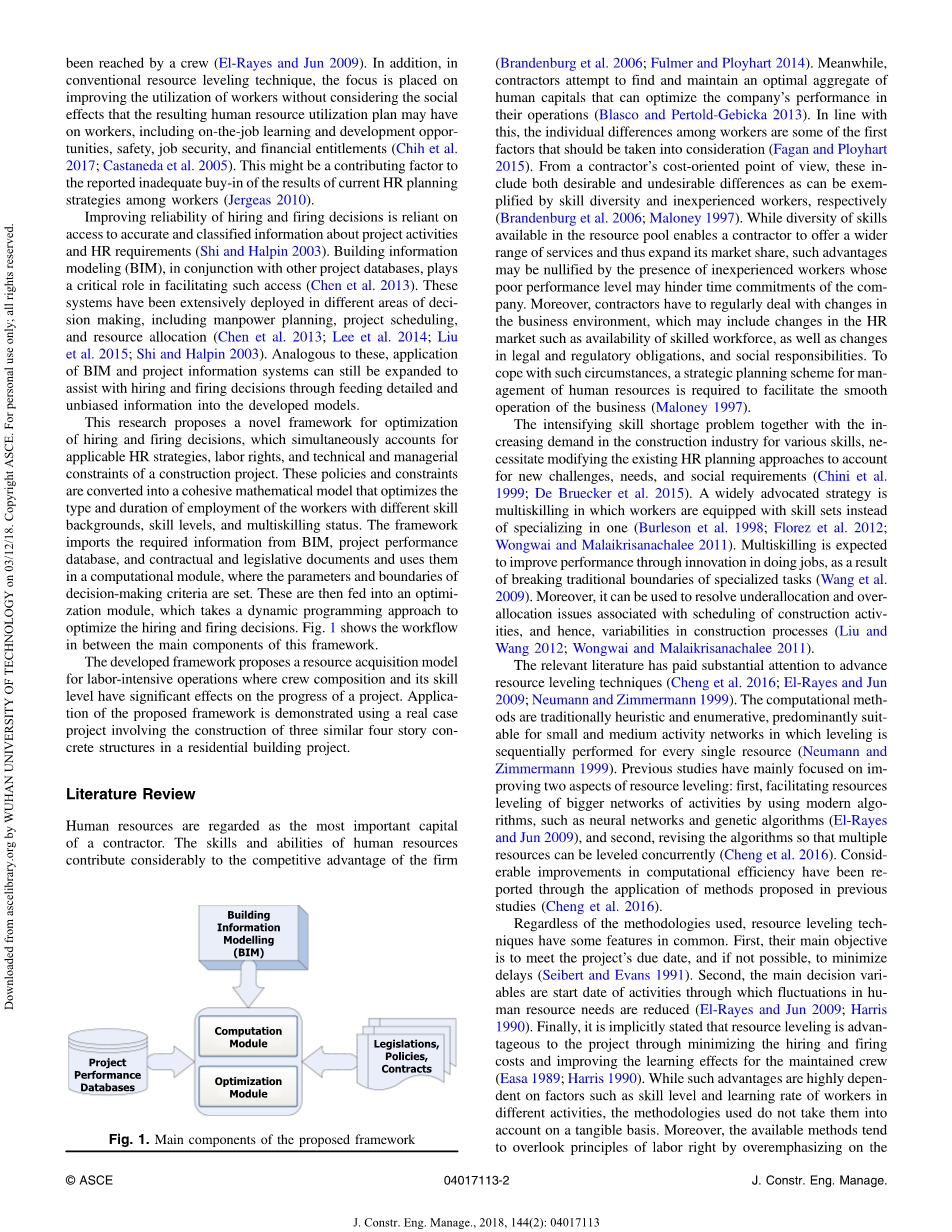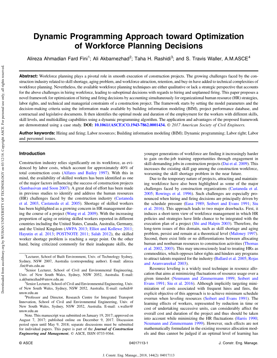 摘要:一个好的劳动力计划在建筑工程的顺利实施中起着举足轻重的作用。建筑行业面临着日益增长的挑战,如技能短缺、员工老龄化、劳动力吸引不足、保留和购买问题,这些都无疑增加了劳动力规划的技术复杂性。然而,现有的劳动力规划技术要么是定性的,要么缺乏战略视角。这使得在面临上述挑战时,雇佣劳动力的计划安排容易在雇佣和计划外解雇方面做出不佳的决定。本文提出了一种基于人力资源战略、劳动权利和建设项目的技术和管理约束的优化招聘与解雇决策的新框架。该框架首先通过构建信息建模(BIM)、项目性能数据库、契约和立法文档的信息来设置模型参数和决策标准。然后使用动态规划算法确定不同技能、技能水平和多技能的工人的最佳工作模式和持续时间。通过案例研究,论证了该框架的应用和优点。DOI:10.1061/(ASCE)CO.1943-7862.0001434. copy; 2017 American Society of Civil Engineers.
