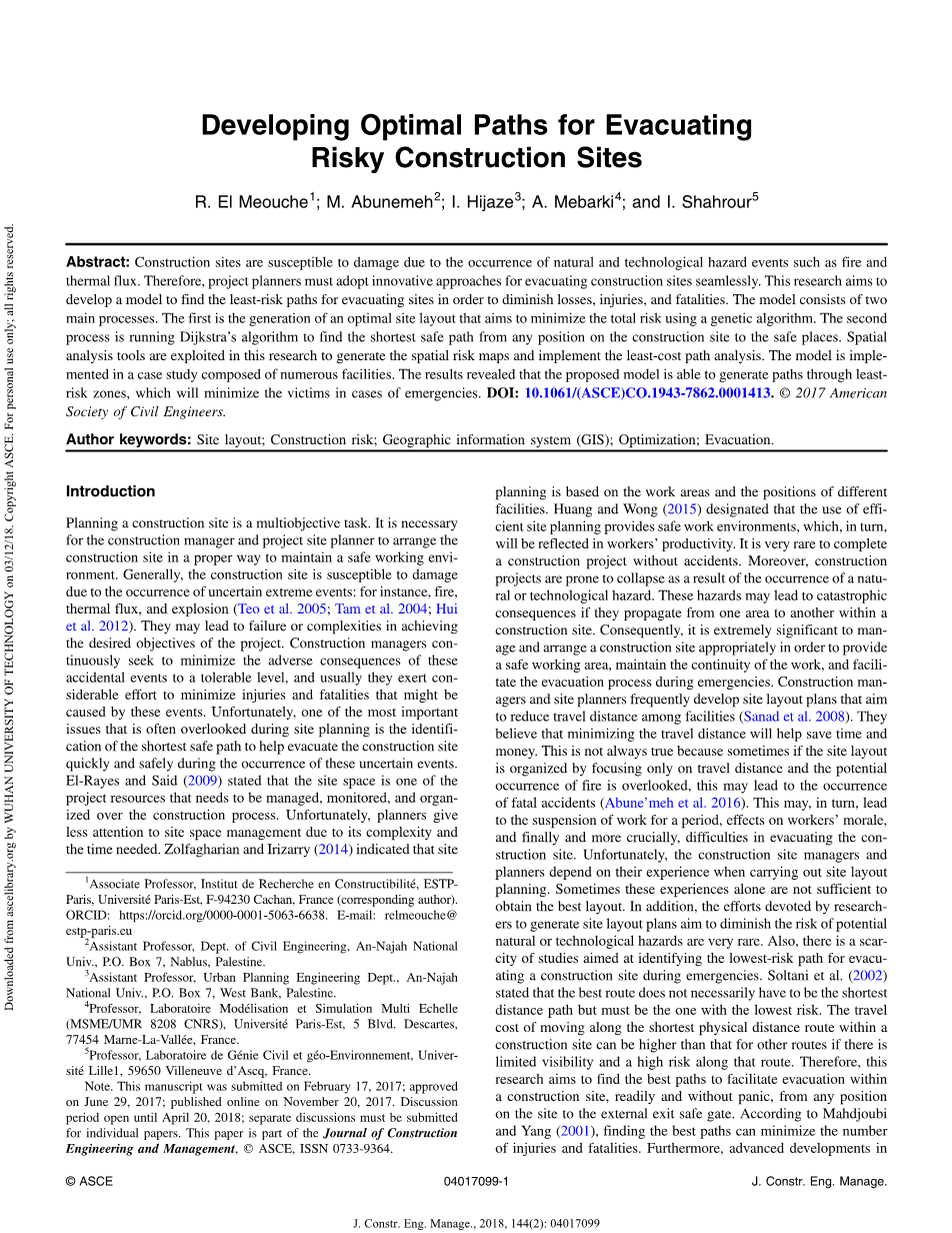 摘要:建筑工地容易因为自然和技术灾害事件的发生而受到损坏,如火灾和热通量。因此, 项目规划者必须采用创新方法来无缝疏散施工工地。本研究旨在通过建立一个模型以寻找风险最小的疏散场地创建路径,从而减少损失、伤害和死亡。该模型由两个主要过程构成:第一个是最佳场地布局的生成, 目的是利用遗传算法将总风险降到最低;第二个过程是运行迪杰斯特拉算法从建筑工地的任一地点到安全位置的路径中找到最短的安全路径。本研究利用空间分析工具生成空间风险图和实施最小成本路径分析。该模型是在一个由众多设施组成的案例研究中实现的。结果表明,所提出的模型能够通过最小风险带生成能够在紧急情况下使得损害最小化的路径。