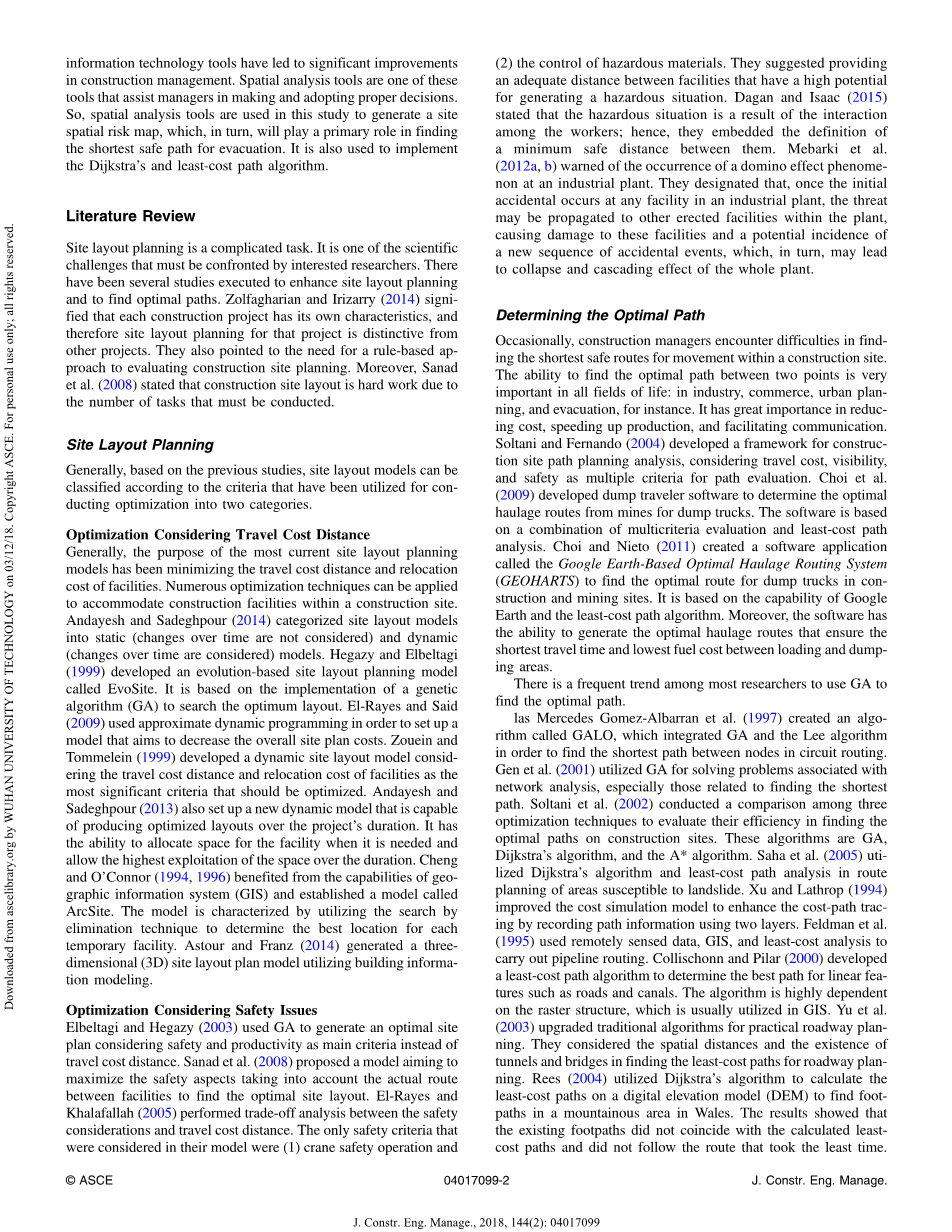 偶尔,施工管理者会在寻找施工现场最短的安全路线时遇到困难。找到两点之间最佳路径的能力在所有生活领域都非常重要:例如工业、商业、城市规划和疏散。它在降低成本、加快生产和促进沟通方面具有重要意义。Soltani和Fernando(2004)为建筑工地路径规划分析开发了一个框架,将出行成本、可视性和安全性作为路径评估的多重标准。Choi等人 (2009)开发了转储旅行软件,以确定从倾倒卡车的矿山获得的最佳运输路线。该软件基于多标准评估和最低成本路径分析的组合。崔和涅托(2011)创建了一个名为Google Earth-Based Optimal Haulage Routing System(GEOHARTS)的软件应用程序,为建筑和采矿场所的自卸卡车寻找最佳路线。它基于Google Earth和最低成本路径算法的功能。 此外,该软件还能够生成最佳运输路线,确保装载和卸载区域之间的最短行驶时间和最低燃料成本。