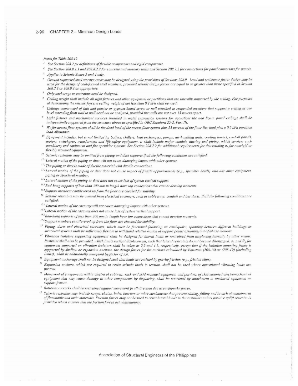 14 隔振器支撑设备应设计应对侧向荷载或以其他方式产生侧向位移,该限制侧向位移的约束也不应脱离存在。隔振器支撑设备的ap与Rp应分别取值为2.5和1.5。除了当隔离安装框架以浅锚或膨胀锚支撑时,锚钉的设计力值应考虑附加因子为2.0按照方程208-18与208-19计算(含限值)。