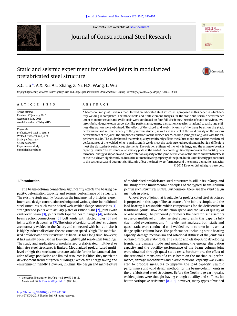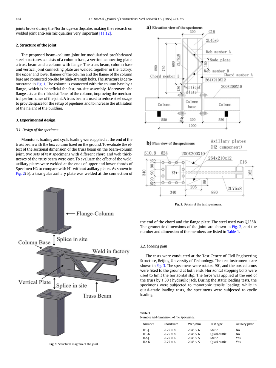 本文提出了一种适用于预制钢结构的新型节点。 接头结构简单,承载合理,弥补了传统接头的缺陷:施工速度慢,现场焊接质量不高。 所提出的接头满足了在多层或高层钢结构中快速装配的需要。 在本文中,一个完整的模型实验和有限元分析,静态和准静态,进行了4焊接梁柱接头与ange拼接柱基。 通过静态试验获得静态承载力,损伤机理和接头转动刚度等性能。 通过准静态试验得到梁柱节点的弹塑性发展趋势,损伤模式与机理,耗能能力与延性性能。 此外,评估了桁架梁的截面尺寸对机械性能,损伤机理和塑性转动能力的影响,提出了提高预制钢梁柱节点的承载能力,抗震性能和有效设计方法的措施结构。 在北岭地震之前,焊接接头被认为具有足够的延展性和刚度以获得更好的抗震性[8–10]; 然而,许多类型的焊接在北岭地震期间接头断裂,使得焊接接头抗震性能的研究非常重要。