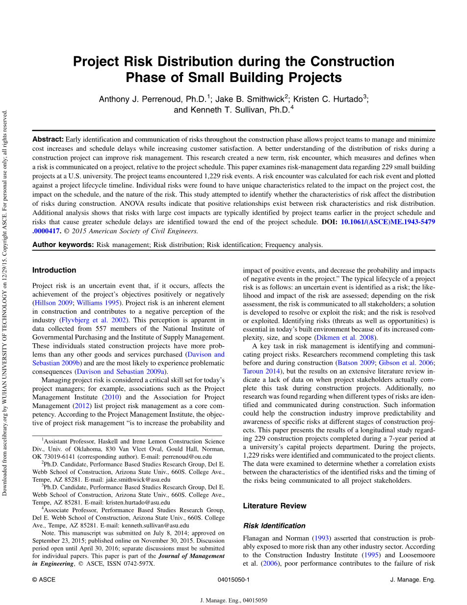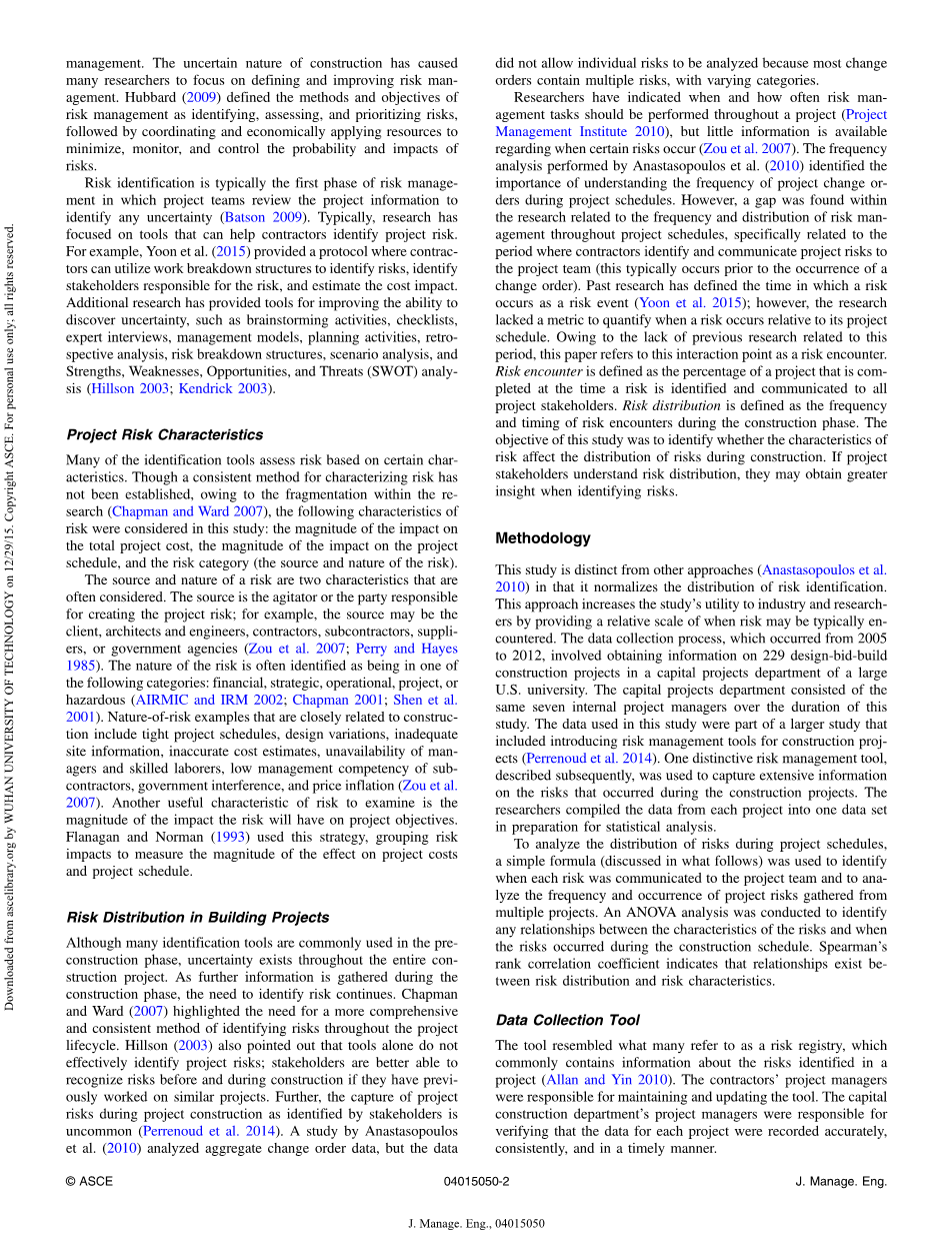 研究人员已经指出在整个项目中应该何时和多长时间进行风险管理任务(项目 管理学院2010),但关于何时发生某些风险的信息很少(邹等人。 2007年)。 Anastasopoulos等人进行频率分析。 (2010)确定了在项目进度表中了解项目变更单的频率的重要性。 然而,在整个项目进度计划中与风险管理的频率和分布有关的研究中发现了一个缺口,具体涉及承包商识别项目团队并向项目团队传达项目风险的期间(通常发生在发生变更订单之前)。 过去的研究已经将风险发生的时间定义为风险事件(Yoon等人。 2015年); 然而,相对于项目进度而言,风险发生时,研究缺乏量化的指标。 由于缺乏与此期间有关的先前研究,本文将此交互点称为风险相遇。 风险相遇被定义为在风险被识别并传达给所有项目利益相关者时完成的项目的百分比。 风险分配被定义为施工阶段风险遭遇的频率和时间。 本研究的目的是确定风险特征是否影响施工期间风险的分布。 如果项目利益相关者理解风险分配,他们在识别风险时可能会获得更多的洞察力