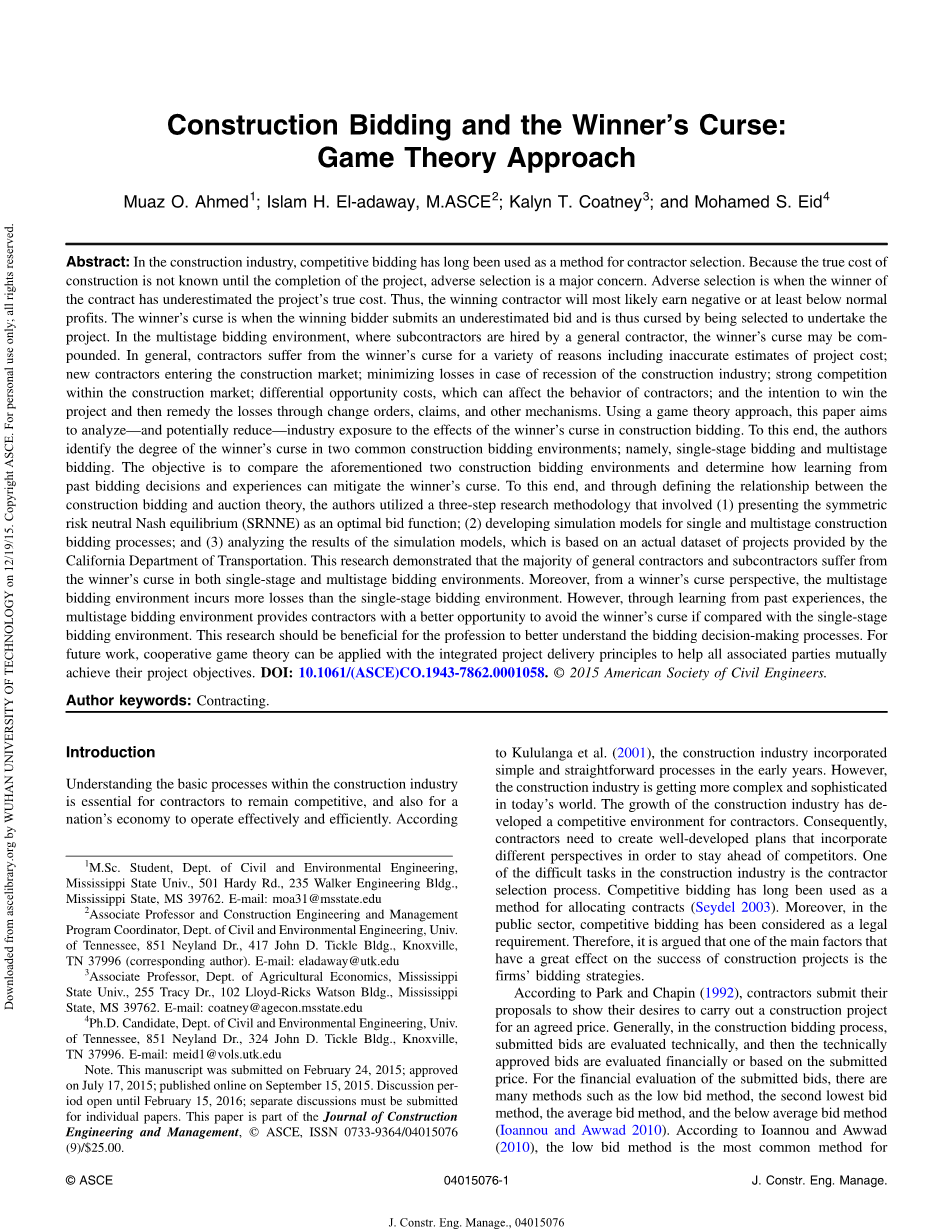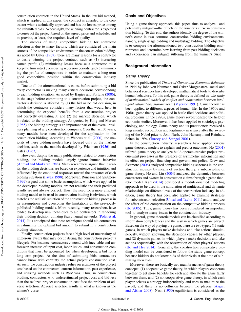 摘要:在建筑行业中,竞争性招标一直被用作承包商选择的一种方法。 由于在项目完成前才知道施工的真实成本,因此逆向选择是一个主要问题。 逆向选择是指合同赢者低估了项目的真实成本。 因此,胜出的承包商很可能会获得负值或至少低于正常利润。 获胜者的诅咒是当获胜的投标人提交低估的投标并因此被选中进行该项目而受到诅咒时。 在分包商被总承包商聘用的多级招标环境中,胜者的诅咒可能会复杂化。 一般来说,承包商因各种原因而受到赢家的诅咒,包括对项目成本的估算不准确; 新的承包商进入建筑市场; 尽量减少建筑业衰退时的损失; 建筑市场竞争激烈; 差异机会成本,这可能会影响承包商的行为; 并打算赢得项目,然后通过变更单,索赔和其他机制弥补损失。 本文使用博弈论的方法,旨在分析(并可能减少)行业对建筑投标中赢者诅咒的影响。 为此,作者在两种常见施工招标环境中确定了获胜者的诅咒程度; 即单阶段招标和多阶段招标。 目标是比较上述两种建筑招标环境,并确定从过去的出价决定和经验中学习如何减轻赢家的诅咒。 为此,通过定义建筑投标与拍卖理论之间的关系,作者运用了三步研究方法,包括(1)将对称风险中性纳什均衡(SRNNE)表示为最优投标函数; (2)开发单级和多级施工招投标过程的模拟模型; (3)分析模拟模型的结果,该模型基于加利福尼亚交通部提供的项目的实际数据集。 这项研究表明,大多数总承包商和分包商在单阶段和多阶段招标环境中遭受赢家的诅咒。 此外,从赢家的诅咒角度看,多阶段招标环境比单阶段招标环境招致更多的损失。 然而,通过从过去的经验中学习,与单阶段招标环境相比,多阶段招标环境为承包商提供了避免赢家诅咒的更好机会。 这项研究应该有利于专业人士更好地理解投标决策过程。 对于未来的工作,合作博弈理论可以与综合项目交付原则一起应用,以帮助所有相关方相互实现其项目目标。 DOI: 10.1061 /(ASCE)CO.1943-7862.0001058。 copy;2015美国土木工程师学会。