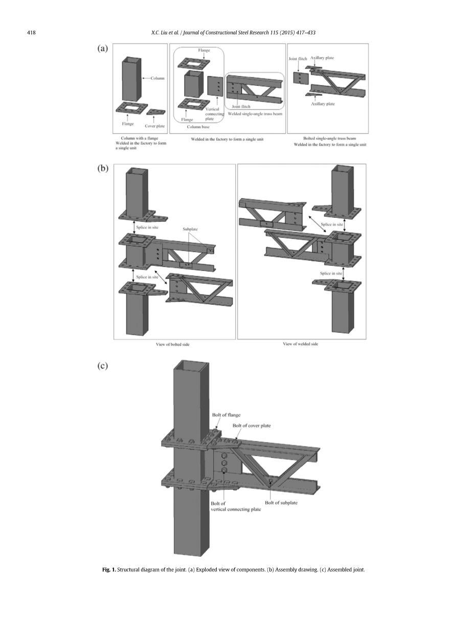 梁柱连接是预制钢结构的核心技术。在设计梁柱节点时,必须充分考虑现场的装配能力,以确保其力学性能:包括强度、刚度和延性。本研究为模块化预制多层钢结构和高层钢结构提供了一种新型的螺栓焊接节点。所提出的节点用于连接两个封闭模块,可以方便地在现场快速组装。如图1所示,该接头由一块上下端装有翼缘的柱基、一块单角钢桁架焊接柱基、一块带有垂直连接板和上下端盖的单角钢桁架螺栓柱基、两个接头盖片,两个共同组合板,和一个垂直的连接板。每个接缝盖板和相应的翼缘组成一个部件,被命名为盖板翼缘,焊接到该列在工厂的末端。