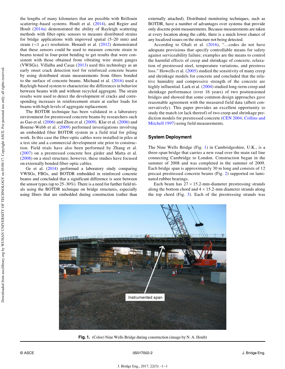 2008年,英国剑桥市南部建了一座新的公路桥。九井桥提供了一个理想的测试平台,用于试验适用于施工期间安装的新型传感器和仪器技术。一种这样的技术有可能在施工期间嵌入到结构中使用光纤传感器(Casas and Cruz 2003)。 光纤应变检测正变得越来越普遍,例如,Costa和Figueires(2012)研究了在葡萄牙钢拱桥上使用光纤技术时的部署难题。 已经提出了用于腐蚀检测的光纤测量(Wang and Huang 2011)和混凝土梁裂缝检测(Deif et al。2010; Regier and Hoult 2014b)。使用光纤电缆测量应变已被用作十多年来的结构健康监测(SHM)技术包括嵌入预应力混凝土梁内(Maaskant et al。1997)。