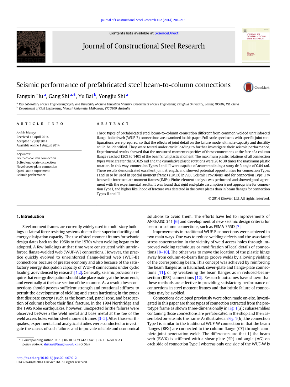 由于其优越的延展性和能量耗散能力,钢框架目前在多层建筑中被广泛用作侧向抗力系统。钢结构框架在抗震设计中的应用可以追溯到20世纪60年代到70年代,当时开始采用焊接。当时的一些建筑物采用非强化的焊接网(WUF-W)连接。然而,由于经济性较高,并且由于循环载荷下WUF-B连接的满意的能量耗散能力,该实践很快演变为无增强的网格式(WUF-B)连接,研究证明[1 ,2]。一般来说,抗震设备要求能量耗散主要发生在梁端,最终发生在柱的基础部分。因此,这些连接应具有足够的强度和旋转刚度,以便在能量耗散区域(如柱的梁端,面板区和基座部分)发生屈服和应变硬化之前最终的骨折。然而,在1994年的北岭和1995年的神户地震中,在钢矩架内的焊缝通孔的脚趾处观察到焊缝金属和基体金属之间意外的脆性破坏[3-5]。在这些地震之后,进行了实验和分析研究以调查这些失败的原因并提供可靠经济能够避免它们的解决方案。这些努力导致了ANSI / AISC 341 [6]的改进,以及开发了用于梁 - 柱连接的新型抗震设计标准,如FEMA-355D [7]。