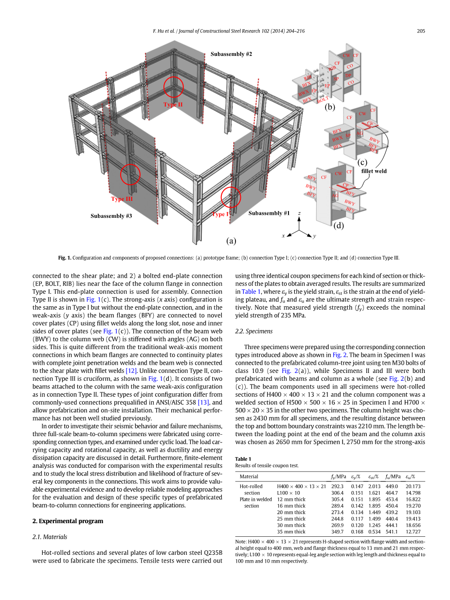之前开发的连接通常是现场制作的。本文研究的三种类型的连接从原型框架中提取,如图1(a)所示。包含这些连接的子装配在工厂预制,然后在现场整合到框架中。如图1(b)所示,I型连接与传统的WUF-W连接相似之处在于,横梁(BFX)通过完整的接头穿透焊接连接到立柱(CF)。不同之处在于:1)梁式腹板(BWX)在连接类型I的每侧上用剪切板(SP)和角度(AG)加强,而WUF-W的仅一侧是连接到剪切板;和2)螺栓连接的端板(EP,BOLT,RIB)位于立柱连接面的附近类型I.此端板连接用于组装。连接类型II如图1(c)所示。强轴(x轴)配置是与I型相同,但没有端板连接,弱轴(y轴)光束闪光(BFY)连接到新颖盖板(CP)沿着长槽,鼻子和内部使用熔接焊接盖板的两侧(见图1(c)。梁网的连接(BWY)在柱网(CW)上的角度(AG)加强两侧。这与传统的弱轴时刻截然不同梁的凸起连接到连续板上的连接具有完整的接头穿透焊接和梁腹板连接到带有接焊缝的剪切板[12]。与连接类型II不同,conIII型是十字形的,如图1(d)所示。它由两部分组成横梁以相同的弱轴配置连接到立柱上如关联类型II。这些类型的联合配置不同于