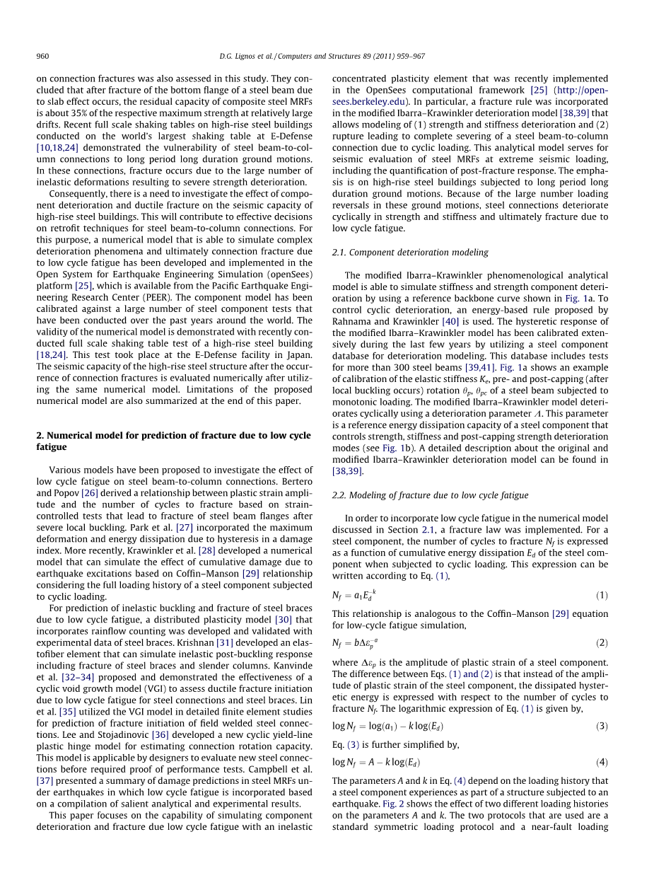 为了对由低周疲劳导致的非弹性屈曲和钢支撑断裂进行预测,通过最近在OpenSees[25](http://open-sees.berkeley.edu)计算框架中实施的集中塑性元素,开发并验证了一种包含雨流计数的分布式塑性模型[30]。特别是,在改进的Ibarra-Krawinkler退化模型[38,39]中加入了一个断裂规则,该模型允许对(1)强度和刚度退化,(2)以及由于循环加载,断裂导致了一个钢梁柱节点的完全切断进行建模。该分析模型用于在极端地震荷载作用下对钢MRFs进行地震评价,包括对断裂后反应的量化。重点是在高层钢结构上长周期长持时的地震。由于在这些地震中有大量的负载逆转,钢节点在强度和刚度上周期性地恶化,并最终因低周疲劳而破裂。