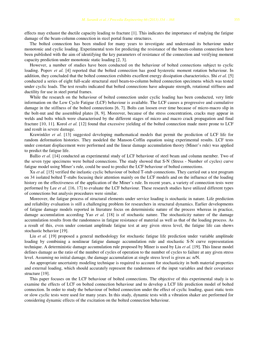 Ballio等人[14]进行了钢梁和柱件低周疲劳行为的实验研究。七种类型的标本中有两个是螺栓连接。研究表明,使用Miner规则的S-N(应力-循环次数)曲线疲劳模型可用于预测螺栓连接的低周疲劳行为。