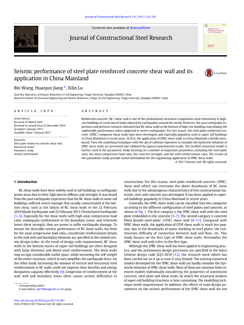 钢筋混凝土(RC)剪力墙是广泛用于高层的主要结构部件之一,来抵抗由于世界各地地震引起的横向荷载.但是,过去的地震经验和以前的研究表明,高层建筑底部的钢筋混凝土剪力墙可以在遭受严重地震时显示出未曾预料的性能.为此,钢板钢筋混凝土(SPRC)复合剪力墙得到发展,特别是近几年在中国超高层建筑中得到普遍应用.首先, SPRC剪力墙在中国广泛应用,基于软件OpenSees的建模技术来模拟钢纤维混凝土剪力墙的滞回性能得到了传统试验结果的验证.验证的数值模型被进一步用于参数研究,重点关注一些重要参数,包括应用钢板的比率、轴向压缩荷载比、混凝土强度和腹板加筋比.这个参数研究为SPRC剪力墙的工程应用提供了有用的信息.