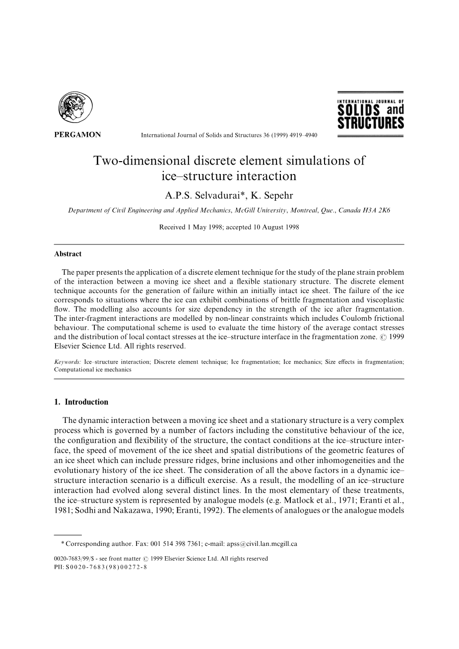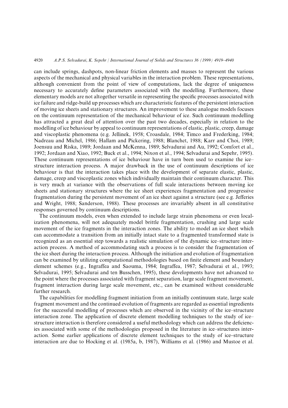 移动的冰盖和静止结构之间的动态相互作用是一个非常复杂的过程,受多种因素控制,包括冰的本构行为,结构的构造和灵活性,冰结构界面处的接触条件 ,冰盖的运动速度以及冰盖几何特征的空间分布,其可以包括压力脊,盐水包裹体和其他不均匀性以及冰盖的演变历史。 在动态结构交互场景中考虑所有上述因素是一项困难的工作。 结果,冰结构相互作用的建模已经沿着几条不同的路线发展。 在这些处理中最基本的部分,冰结构系统由模拟模型表示(e.g. Matlock et al., 1971; Eranti et al., 1981; Sodhi and Nakazawa, 1990; Eranti, 1992) . 类似物或模拟模型的元素可以包括弹簧,缓冲器,非线性摩擦元件和质量来表示相互作用问题中机械和物理变量的各个方面。尽管从计算的角度来看这些表示虽然方便,但缺乏准确定义与建模相关的参数所必需的唯一性程度。此外,这些基本模型并不是完全通用的,用于表示与冰崩和脊形建立过程相关的具体过程,这些过程是移动冰盖和静止结构持续相互作用的特征。对这些模拟模型的改进侧重于冰的力学行为的连续表示。这种连续体模型在过去二十年中引起了很大的关注,特别是在涉及弹性,塑性,蠕变,损伤和粘塑性现象的连续表征 (e.g. Jellinek, 1958; Croasdale, 1984; Timco and Frederking, 1984; Nadreau and Michel, 1986;Hallam and Pickering, 1988; Buck et al., 1994; Karr and Choi, 1989; Joensuu and Riska, 1989;Jordaan and McKenna, 1989; Selvadurai and Au, 1992; Comfort et al., 1992; Jordaan and Xiao, 1992; Buck et al., 1994; Nixon et al., 1994; Selvadurai and Sepehr, 1995) . 这些冰行为的连续表征又被用于研究冰结构相互作用过程。 使用冰行为的连续描述的一个主要缺点是相互作用发生在独立的弹性,塑性,损伤,蠕变和粘塑性区域的发展,这些区域单独保持其连续性特征。 这与移动冰盖和静止结构之间的全尺度相互作用的观察结果大不相同,在冰盖持续移动到结构上的过程中,冰盖经历碎裂和逐渐碎裂 (see e.g. Jefferies and Wright, 1988; Sanderson, 1988) .这些过程总是不存在于连续描述所支配的所有构成响应中。 连续模型即使扩展到包括大应变现象甚至局部化现象,也不足以模拟相互作用区域中冰碎片的脆性碎裂,破碎和大规模运动。 模拟能够适应从初始完整状态到碎裂变换状态的转变的冰盖的能力被认为是实现动态冰结构相互作用过程的真实模拟的关键步骤。 适应这种过程的方法是在交互过程中考虑冰层的碎裂。 虽然碎裂的发生和演变可以通过利用基于有限元和边界元方案的计算方法来检验 (e.g., Ingraffea and Saouma, 1984; Ingraffea, 1987; Selvadurai et al., 1993; Selvadurai, 1995; Selvadurai and ten Busschen, 1995) , 这些发展还没有发展到与片段分离,大规模片段运动,大规模运动期间的片段相互作用等有关的过程可以在没有进一步研究的情况下进行检查。 从初始连续体状态,大尺度碎片运动和碎片的持续演化建模碎片的能力被认为是在冰结构相互作用区附近观察到的过程的成功建模的基本要素。 因此,离散元素建模技术在研究结构 - 相互作用中的应用被认为是一种有用的方法,可以解决与冰结构相互作用中文献中提出的一些方法相关的缺陷。 离散元素技术在冰结构相互作用研究中的一些早期应用是由于Hocking等人(Hocking et al., 1985a, Hocking et al., 1985b, Hocking et al., 1987) , Williams et al. (1986) and Mustoe et al. (1987)他们研究了平面冰盖与静止结构的相互作用。这些作者开发的离散元素程序有能力适应通过应用相对简单的标准从连续统一到分散状态的转变。另外,通过考虑可以分配非线性交互式约束的片段的动态,来容纳冰块的大规模移动和相互作用。在这项研究中,离散元素建模过程中提出的基本概念和方法被扩展到检查动态冰结构相互作用过程。第一种修改涉及在应力状态主要为压应力的区域引入粘塑性失效的概念,并且在应