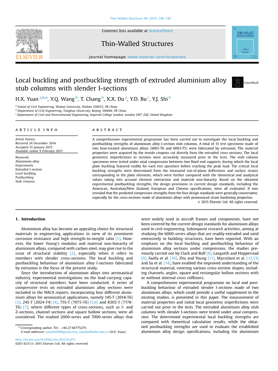 本文介绍了一个关于由两种铝合金制成的受压细长I型截面的局部和屈曲后行为的综合实验程序,它可以为现有研究提供有用的补充。 在测试之前进行材料性能和初始局部几何缺陷的测量。 在轴向压缩下测试具有细长I形截面的挤压铝合金短柱。 将所确定的实验局部屈曲强度与理论计算结果进行比较,从而获得的屈曲后强度用于评估已建立的铝合金设计规范,包括铝设计手册(AA) [15],澳大利亚/新西兰设计标准(AS / NZS) [16],欧洲法规9(EC9) [17] 和中国设计规范(GB) [18].