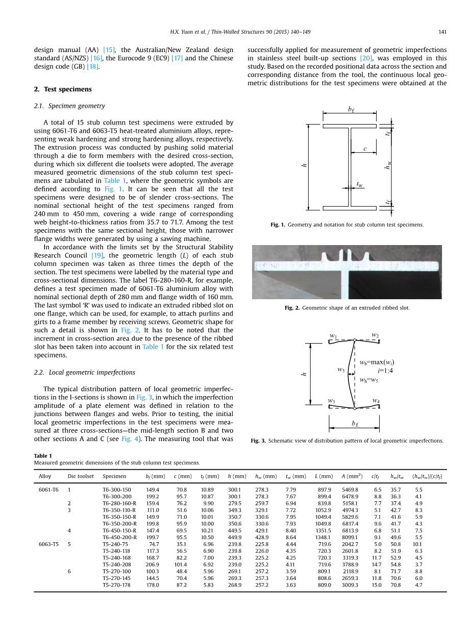 一共压缩15根短柱,使用6061-T6和6063-T5热处理铝合金,分别代表弱硬化和强硬合金。挤压过程是推动固体材料让它穿过模具来形成拥有理想截面的构件,在此期间采用六种不同的模具工具箱。 短柱试样的平均测量几何尺寸列于表格1中,其中几何符号根据图1定义。 可以看出,所有的试验样本都设计成细长的横截面。 试样的正截面高度范围从240毫米到450毫米,覆盖范围广泛 腹板高厚比从35.7到71.7。 在具有相同截面高度的试样中,那些拥有较窄翼缘的试件是用锯子锯出来的。