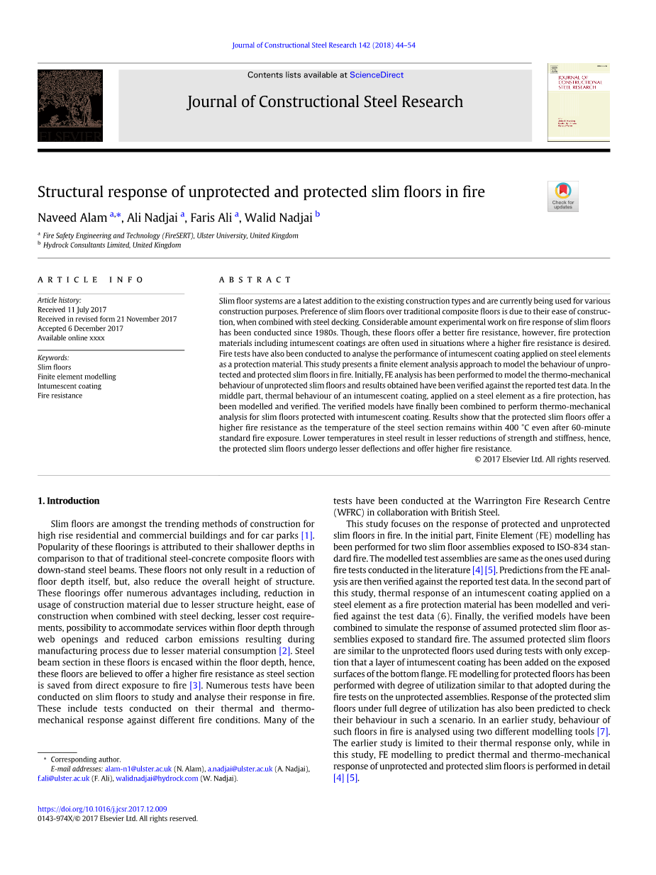 超薄板是高层住宅和商业建筑以及停车场的最流行建筑方法之一。这些板的普及归因于相比传统的钢混凝土组合楼板与倒立钢梁,其较浅的深度。这些楼板不仅使板本身的厚度减小,而且还降低了结构的整体高度。这些楼板提供了许多优点,包括减少建筑材料的使用,因为结构高度低,与钢甲板结合时易于施工,成本要求较低,可以通过网孔减少地板深度,并减少在制造过程中产生的碳排放。在这些楼层中的钢梁部分被包裹在板深度内,因此,这些楼层被认为能够提供更高的耐火性,因为钢截面被免于直接暴露于火灾。在超薄板上进行了大量的试验,研究和分析了它们在火灾中的响应。这些包括对不同的火灾条件下的热响应和热机械响应进行的测试。许多试验已经在英国威灵顿消防研究中心(WFRC)与英国钢铁公司合作进行。
