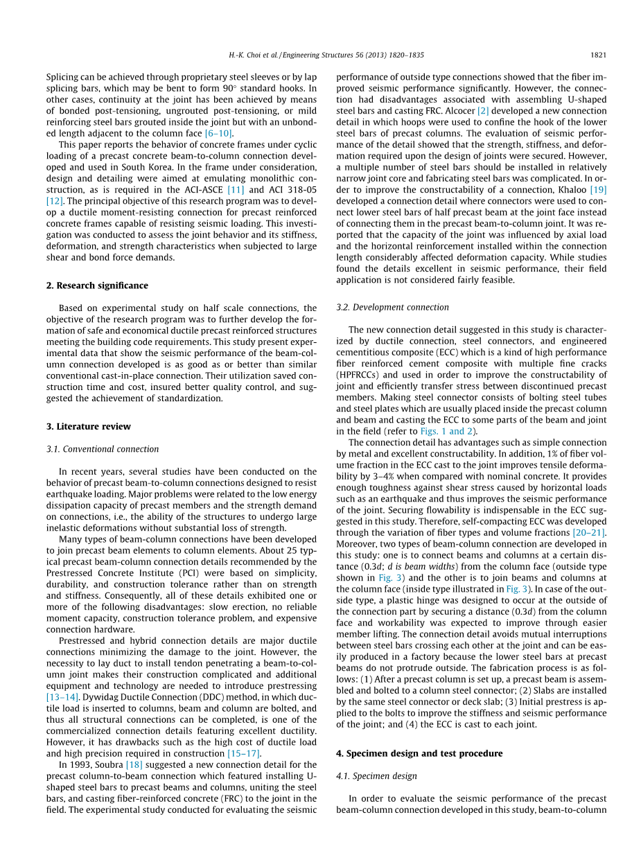 本研究中提出的新连接细节的特点是延性连接,钢连接件,工程水泥基复合材料(ECC)是一种高性能的多细裂纹纤维增强水泥基复合材料(hpfrcs),用于改善预制构件的节点处施工性能,并有效地在非连续预制构件之间传递应力。钢连接件的制作包括用螺栓连接钢管和钢板,这些钢管和钢板通常放置在预制柱和梁内,并在现场将ECC浇筑到梁和接头的某些部分 (参考图1和2)。