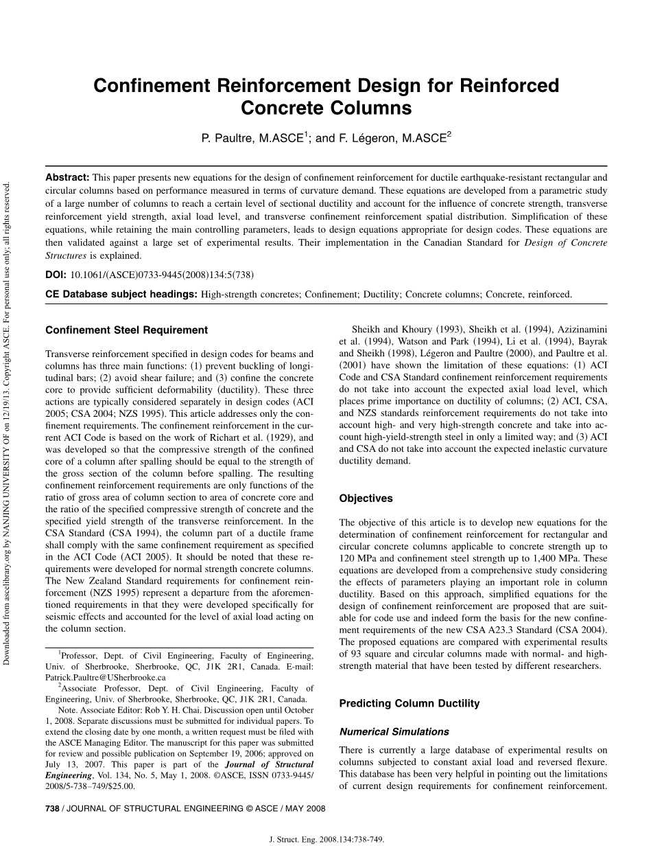 P.Paultre保尔特(美国土木工程师协会会员)【注1】F. Leacute;geron莱热龙(美国土木工程师协会会员)【注2】