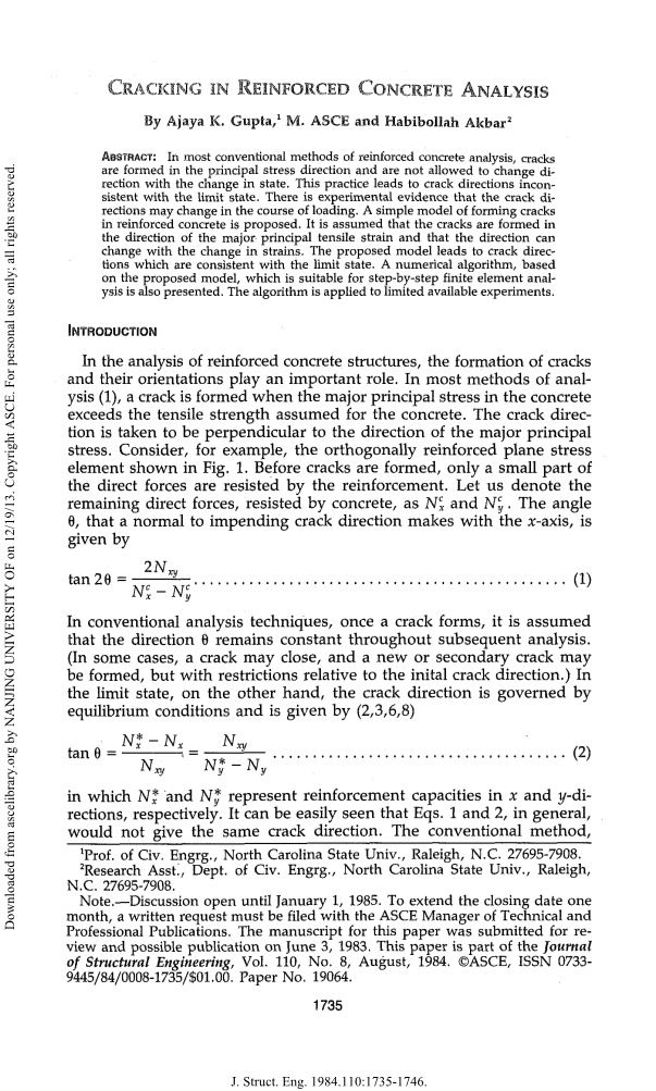 可以假设等式。 1表示初始裂纹方向,而Eq表示。图2表示极限状态下的“控制”裂纹方向。有实验证据表明,在等式中。 1和2的方向不同,随着载荷的增加,新的裂纹形成,初始形成的裂纹变得不那么明显。例如,参见Peter(11)以及Vecchio和Collins(12)的实验。在报告其测试结果时,Vecchio和Collins(12)引入了平均裂纹方向的概念。在任何加载步骤中,都可以将平均裂纹方向定义为平行于最大混凝土刚度的方向,该方向被认为近似垂直于主应变方向。该“平均”裂纹方向是先前提到的“控制”裂纹方向,为简便起见,在随后的综述中,仅将其称为裂纹方向。