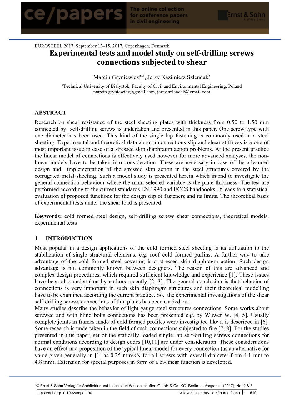 冷弯型钢板最广泛的设计应用是它在单个结构单元里的稳定作用,比如屋顶的冷弯檩条。而应力蒙皮效应是对冷弯钢覆盖板的进一步利用,这种设计优点在设计师中很少有人知晓。原因是它的高等和复杂的设计流程需要足够的知识经验。这些问题最近也在被作者研究【2,3】。总的结论是连接件的性质在这种蒙皮结构中是非常重要的;此外,它们的理论模型需要根据现有技术来检验。因此,薄板的自攻螺栓连接件的受剪试验研究需要被开展。